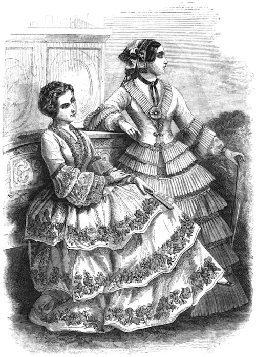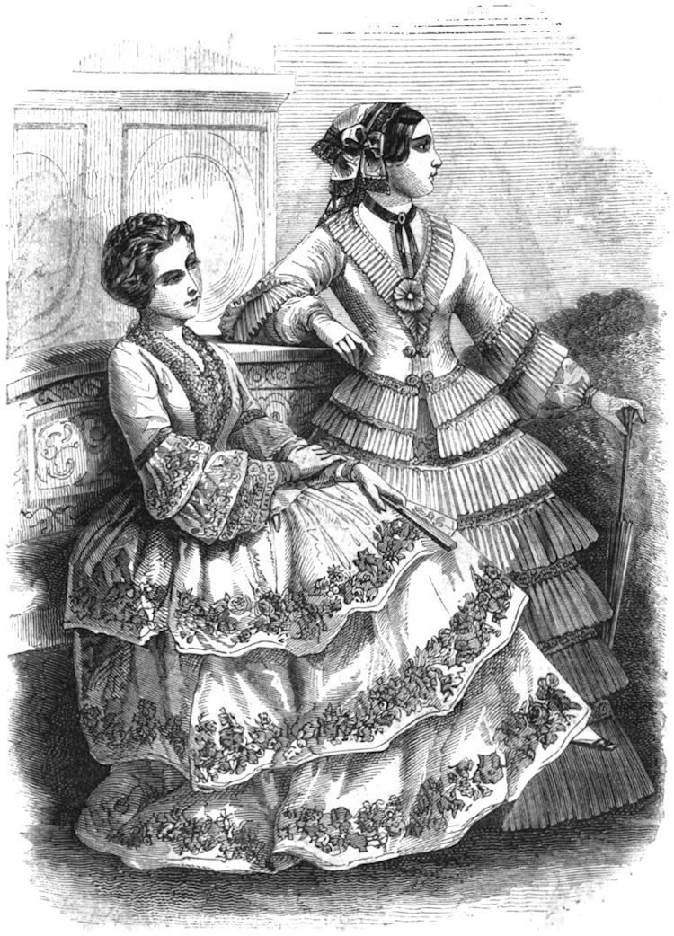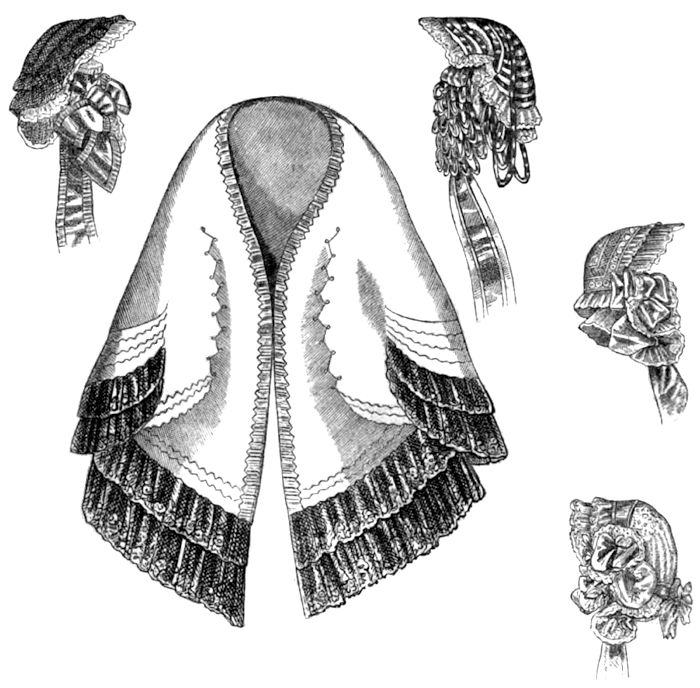 The morning pardessus is also worn with a dress of percale, likewise embroidered; volant and sleeves in English embroidery; the front is trimmed in the same manner; the body is ornamented with a double plait in the stuff, and above the volant, and which replaces the braiding, generally placed on pardessus of tissue. Lastly, are models of sleeves trimmed with lace, one with two open volants; the other closed at the wrist, and trimmed with a manchette of lace.