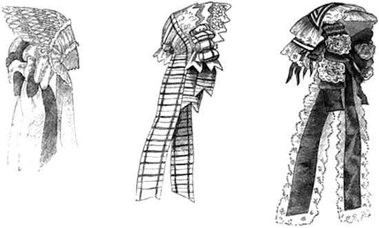 Illustration.—A charming morning dress is thus formed: a dress of barège, of silk pattern, with three volants trimmed with a small quilling à la vieille, and open in front, displaying a lace trimmed neckerchief, (Mechlin lace,) while two small volants finish the sleeves; the last surmounted by a quilling similar to that of the body of the dress.