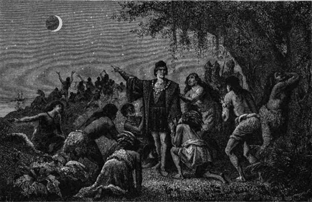 Dans l'illustration de cet ouvrage, on remarquera plusieurs gravures d'après l'antique, de belles planches en couleur auxquelles nous avait déjà accoutumés l'éditeur des Mœurs et Costumes au moyen âge, et des gravures sur bois dont les quatre que nous reproduisons sont un spécimen. L'une nous explique le mouvement de rotation de la terre autour du soleil; l'autre nous montre l'éclipse de lune annoncée par Christophe Colomb aux indigènes de la terre qu'il venait de découvrir; phénomène astronomique qui lui permit d'exercer immédiatement sur eux l'ascendant qu'un homme de génie a toujours sur le vulgaire. Une autre figure reproduit l'observation faite par le P. Secchi d'une tache du soleil arrivée au bord de l'astre, et la quatrième donne une idée de la beauté de la lune vue au télescope la veille du premier quartier. Les personnes qui ne se sont pas encore laissé prendre aux charmes de l'astronomie n'ont qu'à mettre l'œil un beau soir à l'oculaire d'une lunette dirigée vers la lune en croissant ou en quartier; elles n'en croiront pas leur vue et se croiront déjà transportées dans un autre monde.