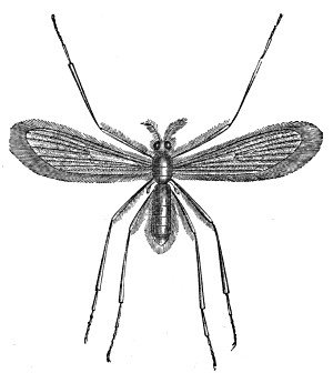 The Ortalinæ are flies of small or moderate size, which are met with principally in woods and fields. The Trypetinæ feed chiefly on fruit. One species, Ceratitis hispanica, is very destructive to oranges in the south of Europe, etc. Of the Piophilinæ, Piophila casei may be taken as the typical example. The larvæ which[106] abound in cheese and bacon are popularly called "Cheese Hoppers," or "Jumpers," in allusion to their habit of springing. The Diopsinæ are principally met with in the tropical parts of the world. They are generally insects of moderate size. Most of the species of Chloropinæ are of small size. Their larvæ generally live in the stems of corn and various kinds of grasses. The Drosophilinæ are small, dull-coloured flies, the larvæ of which feed on fungi, rotten fruit, and similar substances.