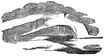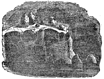 We moved so slowly that I had time to sketch several of these dreamy fabrics. The one which is engraved on the opposite page was an irregular quadrangle, projected at the extremity of a series of ice-structures, like the promontory that ends an isthmus: it was crowned with ramparts turreted by fractures; and at the water-line a great barreled arch went back into a cavern, that « 380 » might have fabled as the haunt of sea-kings or smugglers. Another, much smaller, but still of magnificent size, had been excavated by the waves into a deep grotto; and the light reflected from the bay against its transparent sides and roofs colored them with a blue too superb for imitation by the brush or pencil.