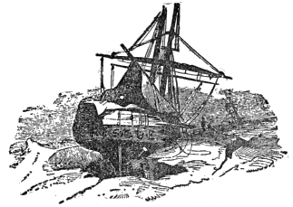 UNE 6. Our bumping continued all I night, without any apparent effect I upon our sticking-plaster. Acting, as this impact does, at the long end of a lever, our stern being immovably fixed, it must be hard upon the rudder post, a beam that is now protruding from the least strengthened part of our brig into a transparent glue of tenacious ice. The twelve-feet saw, suspended from a tripod of spars, is at work, trying to cut a line across the mass to our keel. But for this appendage, we would be now warping through the fissures.