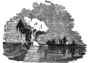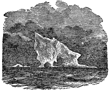We passed the hills of Disco in review, with their terraced summits, simulating the Ghauts of Hindostan; the green-stone cliffs « 378 » round Omenak’s Fiord, the great dockyard of bergs; and Cape Cranstoun, around which they were clustered like a fleet waiting for convoy. They were of majestic proportions; and as we wound our way tortuously among them, one after another would come into the field of view, like a temple set to be the terminus of a vista. At one time we had the whole Acropolis looking down upon us in silver; at another, our Philadelphia copy of the Parthenon, the monumental Bank of the United States, stood out alone. Then, again, some venerable cathedral, with its deep vaults and hoary belfries, would « 379 » spread itself across the sky; or perhaps some wild combination of architectural impossibilities.