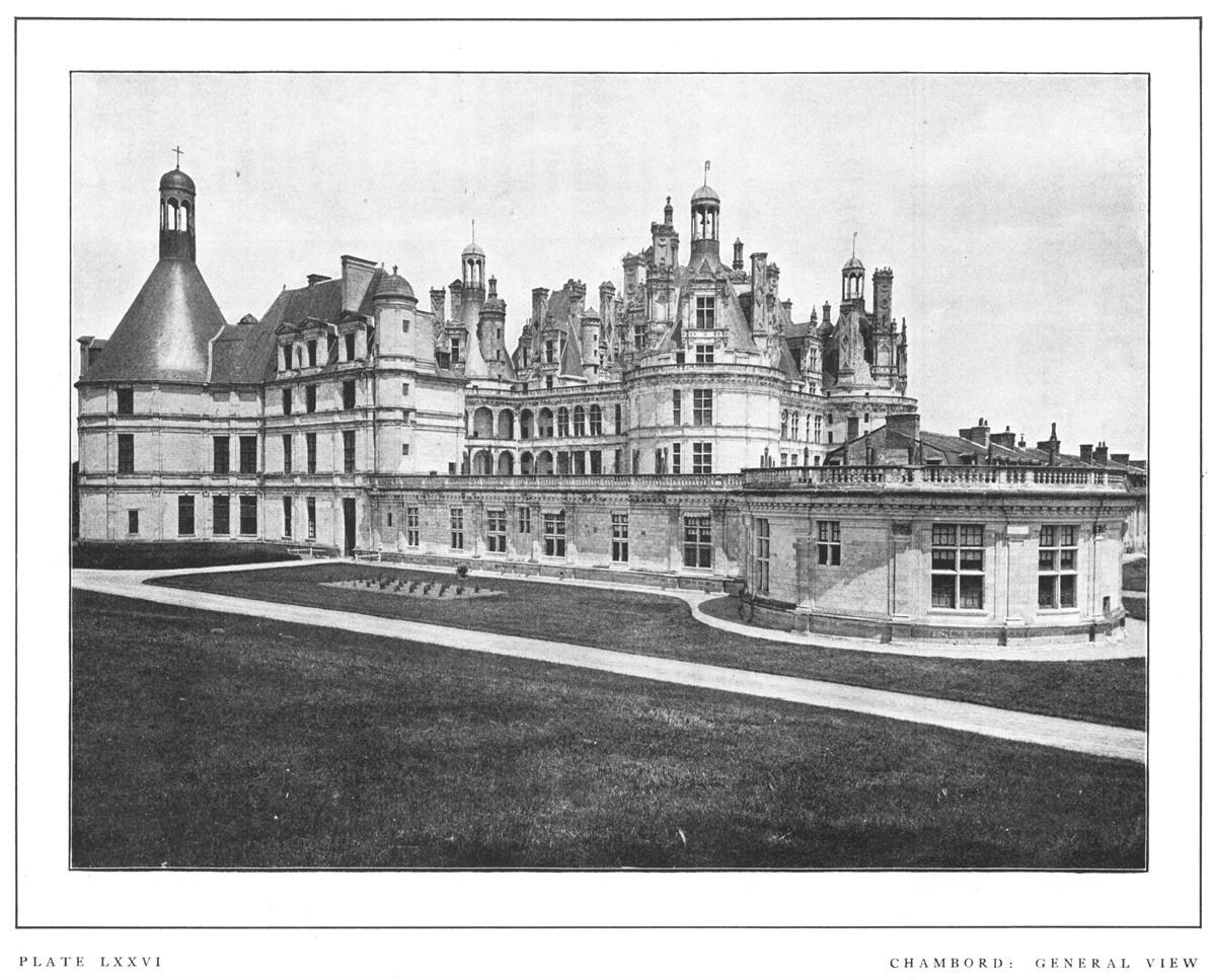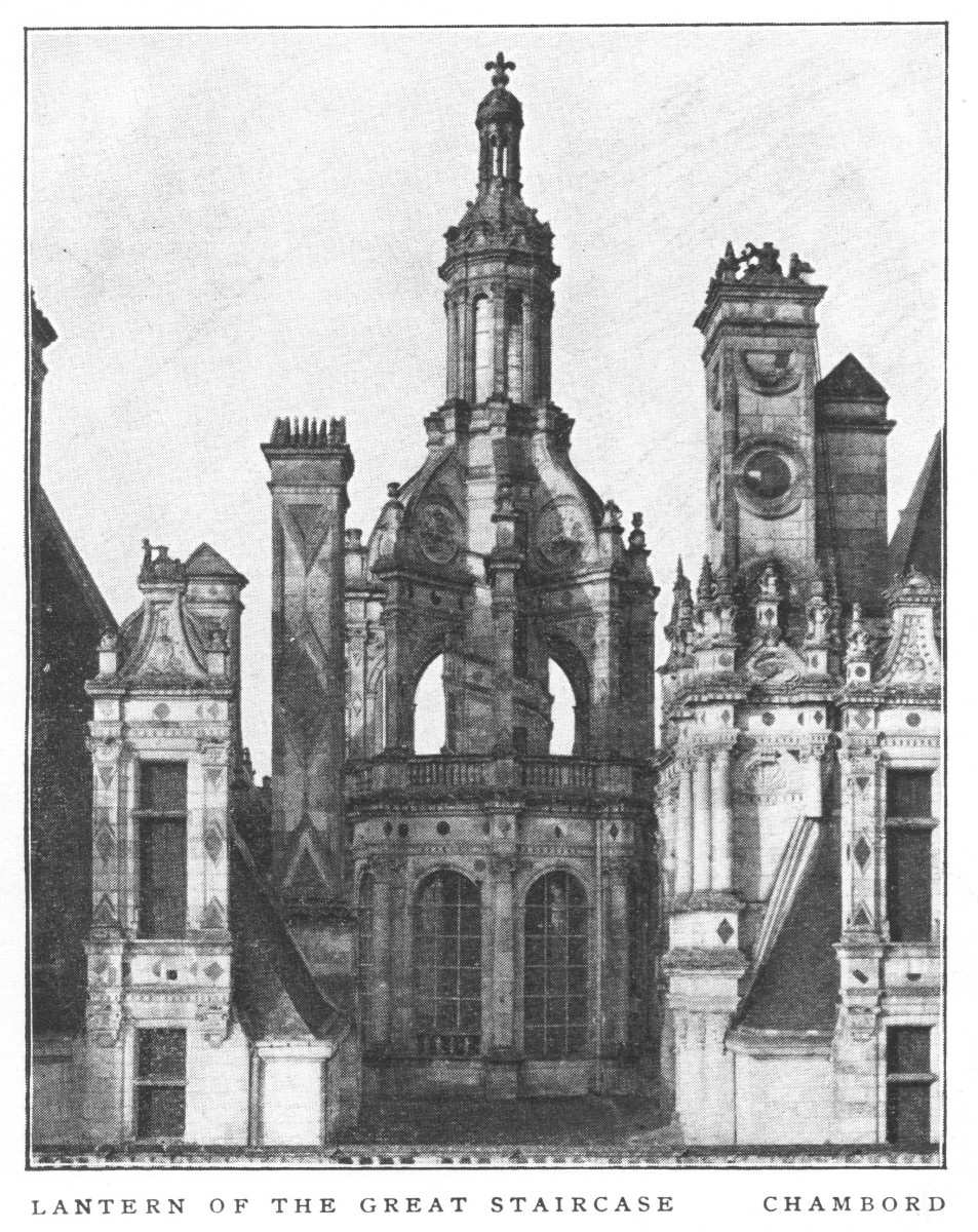 "With a sympathetic denial of any extreme over-technical admiration," writes Mr. Cook in his Old Touraine, "Viollet le Duc gives just that intelligible account of the Château which is a compromise between the unmeaning adulation of its contemporary critics and the ignorance of the casual traveller. 'Chambord,' says he, 'must be taken for what it is; for an attempt of the architect to reconcile the methods of two opposite principles,—to unite in one building the fortified castle of the Middle Ages and the pleasure-palace of the sixteenth century.' Granted that the attempt was an absurd one, it must be remembered that the Renaissance was but just beginning in France; Gothic art seemed out of date, yet none other had established itself to take its place. In literature, in morals, as in architecture, this particular phase in the civilization of the time was evident, and if only this transition period is realized in all its meanings, with all the 'monstrous and inform' characteristics that were inevitably a part of it, the mystery of this strange sixteenth century in France is half explained."