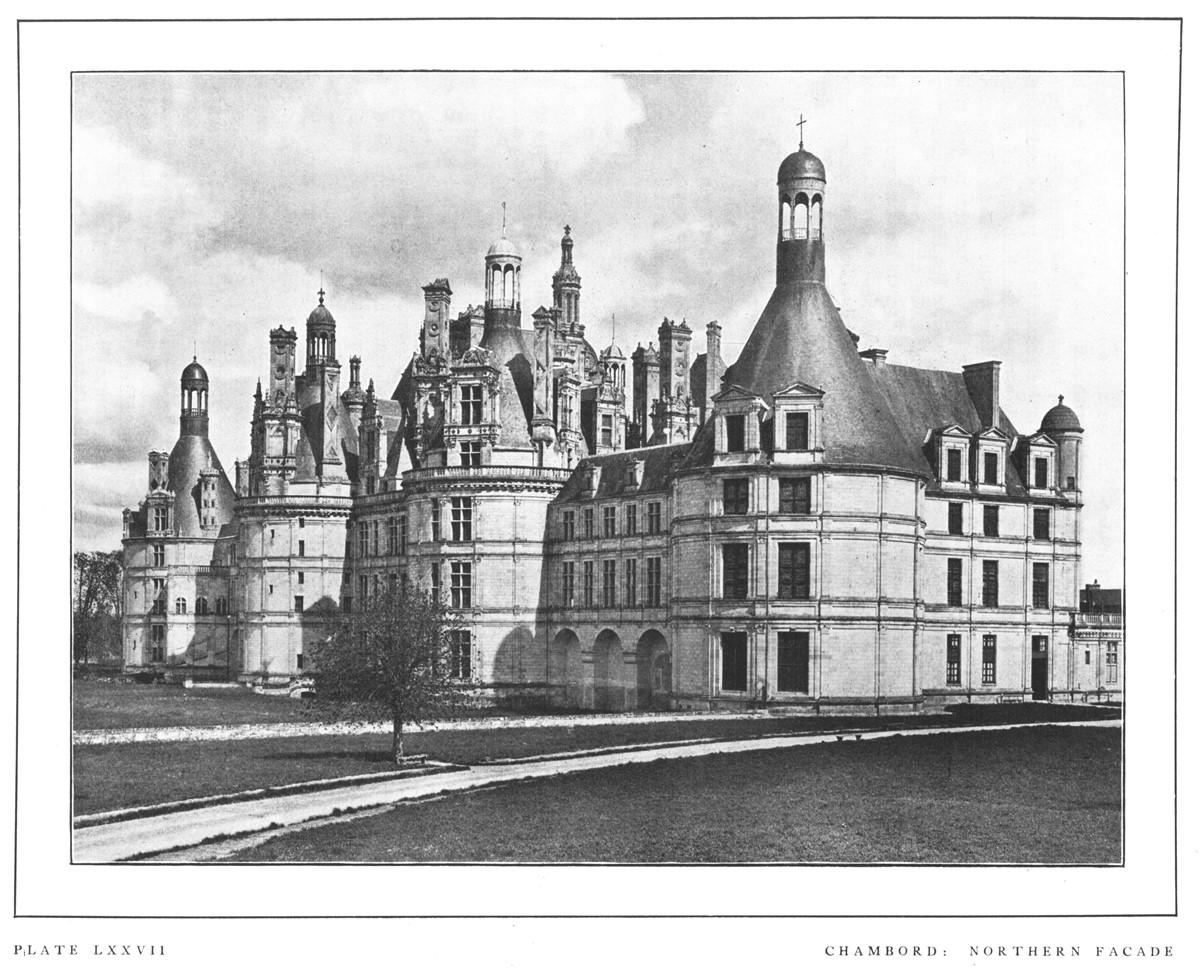 "Chambord is, indeed, throughout truly typical of the earlier stage of the new Renaissance movement. In the general arrangement, in the ordonnance, late Gothic caprice and fantastic love of the unforeseen rule triumphant. The older portions of the Château, the seemingly irregular assemblages of half Oriental turrets and spires, are debased Gothic, full of audacious disregard of all outward seeming of order. The architect, instead of seeking to bring home to the eye the general law, the plan on which the whole is grouped, has wilfully obscured and concealed it beneath the obviousness of the wild and daring conceits heaped above.