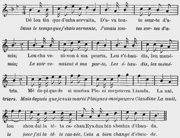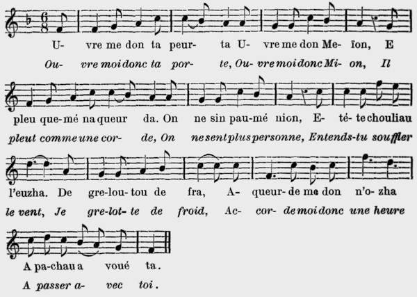 4 Dé mon tourmé pe va ma blonde L'a sheurshezha sè m'arrétau. Pe lamè mamau cha man blanshe De baillezha bin mon grè prau, De l'amou tè que rè su tarra Ne vaut pre ma che n'amitia, Pe la va d'azardezha me n'ama Pe l'a va de vèdra ma via. |