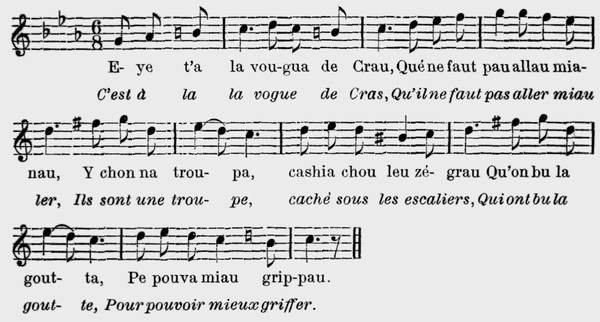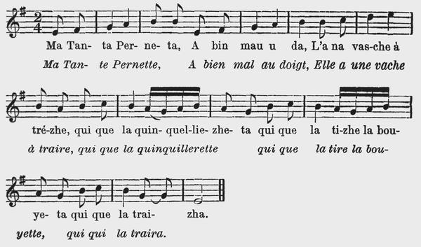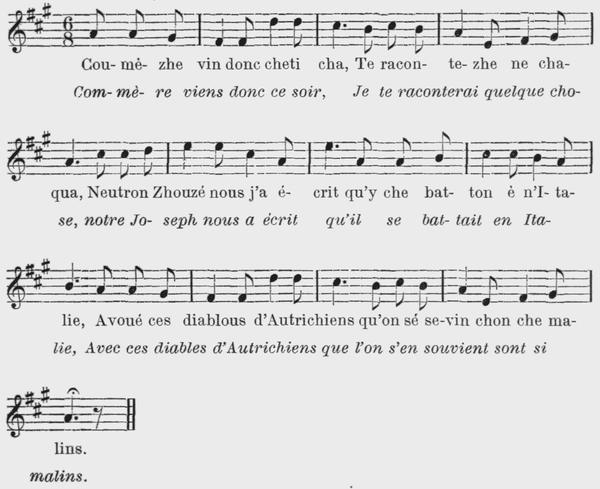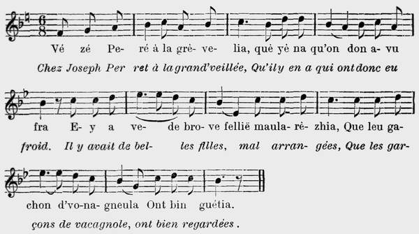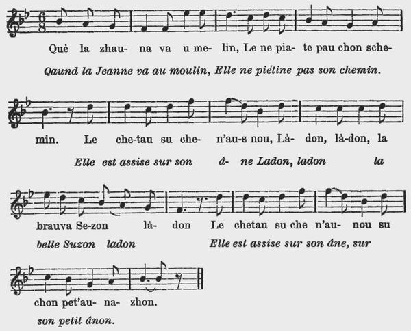 2 Tui leu matin dè la preleia Nou menovin neutreu moton, Me chetova prè de ma meïa, Nou quemèchovin na shèchon, Pi aprè cètië nou dèchovon E nou teniè tui deu la mon, De plasi leu moton chotauvon Mè le ne vin pau mé è shon. |