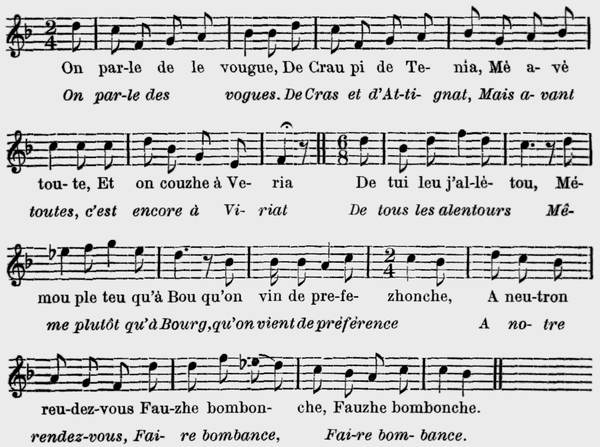 4 Pe leu Brachon que, chon loin de le vele N'a-t-eu pau toute seurte d'agrémè? L'ont pe s'y raidre de bene vatezhe, Pi de shevaux que vont quemè lou vè, Tui leu grè zhou neutre brauve Brachonde Peurton jo shapè brachon garni d'eu, Rè què vayè che le figuzhe fronshe Cè vous revellie l'ama dè lou cœu. bis |