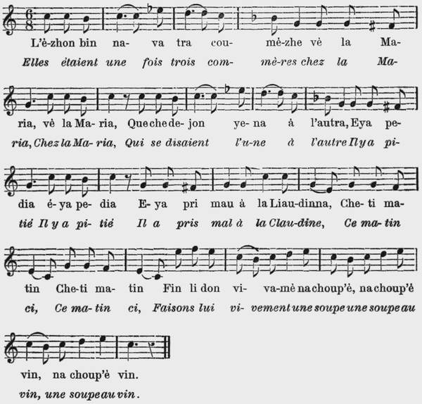 5 Mé, oh qué beneu! ma Liaudin-na A vu meu tourmè, ma douleu, Ch n'ama a compris la min-na Chon bon cœu a compris mon cœu, Pichque pe zh' adoci me pin-ne Le vu bin partazhie mon seu, Que che voulétau cheyon le min-ne Chon beneu fazha mon beneu. |
