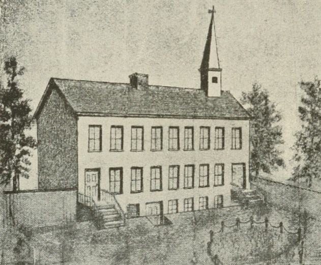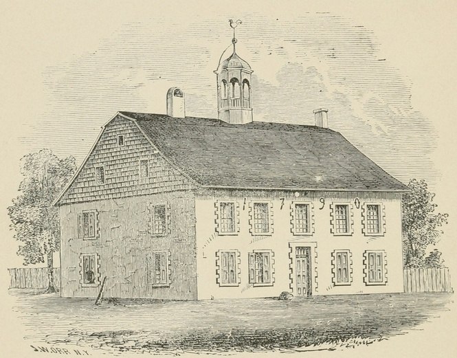 Engelbert Steenhuysen was the first schoolmaster in Bergen, having been licensed October 6th, 1662. He[Pg 28] was allowed two hundred and fifty guilders in wampum annually and "some other stipulations beside the school money, as reason and equity shall demand." It seems that he was required "to look out and procure a suitable place in which to keep the school." According to the Albany records (vide Winfield) the people of Bergen addressed a memorial to the Council that he might be obliged to fulfill his contract to act as Voorleezer and Schoolmaster for two years. The church records do not mention him as Voorleezer. In 1664 the first school-house was built on the lot set apart for school purposes on the northeast corner of the square. Mr. Winfield states that this school-house was of logs, but from the records in the Deacons Account books it evidently was not. It is not known positively whether it was of stone, brick, or frame, but several entries of "lbs. of nails," "whitewashing" and "nailing boards in the gable," are included in the account of work and repairs upon the building. Whatever it was, for about fifty years it was used, and then a new school building was erected on the site of the first. The records state that, "On Tuesday, May 11, 1708, Mathews Bensum had made a foundation, and Mr. Adrian Vermuelen, Voorleezer at Bergen, laid the corner stone."