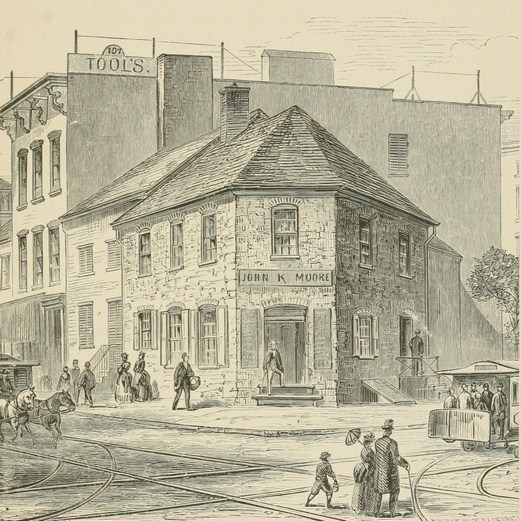 At the Five Corners are several interesting old houses; Riker's Tavern on the southwest corner of Newark and Summit avenues, and Coulter's general store, now a grocery store and dwelling house, on the southeast corner of Newark and Summit avenues. Coulter's Tavern was on the site now occupied by the Avenue House; the old stone house built for a tavern by Mr. John Tise, on the northwest corner of Newark and Summit avenues, and the old building, formerly a store kept by Nicholas and Justus Jerolaman, on the northeast corner of Summit and Hoboken avenues. It is said that at the Corners, just in front of the point where stands the Avenue House, there was formerly a Liberty pole, probably erected about 1812-14, but at a St. Patrick's celebration, not long before the Civil War, there was found in the early morning a St. Patrick hung in effigy upon it; the indignant Irishmen cut the pole down and it was never replaced.