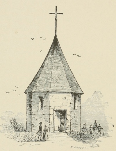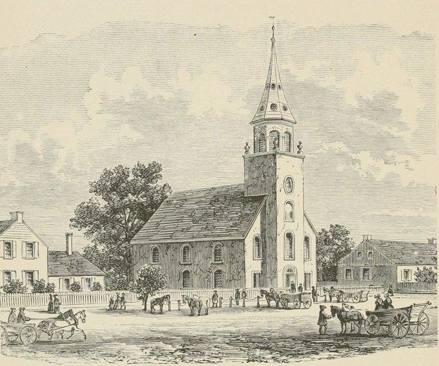 In 1680 the first church building was begun in Bergen, the total cost so far as it is possible to get at the figures, was two thousand six hundred and twelve guilders. It was an octagonal stone building with the roof sloping to a point and surmounted with a vane bearing a rooster. The windows were placed very high. In the summer of 1683 the first bell was placed in the high pointed roof, probably a gift from some of the members. The bricks in the windows and arch over the door were brought from Holland. Over the door was a stone with this inscription: "Kirk Gebouwt in Het yaer 1680." Domine Taylor gives an interesting description of the interior of the "little church" as it is often called in the account books. "The bell-ringer stood in the center of the church. Pews were placed around the walls and occupied only by the men; the women sat in chairs. The pulpit was high and reached by stairs; below and in front of the pulpit was a little pew with a book-board in front of it for the use of the Voorleezer, who had a long rod with a slit in the end which he reached up to the minister, who inserted in the slit notices to be read." The collections were in wampum for many years, and it was one of the duties of the deacons to sell the wampum to the heads of families, who each distributed it among the members of his family and they deposited it in the collection bags. These bags were of black velvet attached to a long pole. At the bottom of each bag was a small bell to arouse[Pg 32] the people at collection time. The bags were hung on hooks in a suitable box beside the pulpit near the deacons' seat; at the proper time the deacons each with bag in hand presented themselves before the pulpit, received their charge from the minister and then went among the congregation and made the collections. The bags were spoken of as "the bell." This custom continued until 1800.