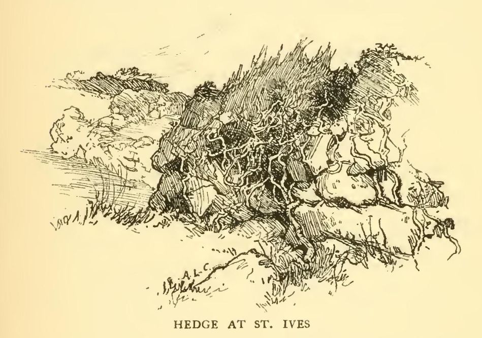 The oldest, toughest, closest and most evenly-cut hedge one knows would hardly afford a safe footing for a man; and as to attempting to get upon or walk on a big unkept hedge, such as are common in the south and west counties on this side the Tamar, the very thought of it is painful. In imagination one sees, and seeing feels, oneself stuck fast in a big bramble bush. In Cornwall I discovered that a stone wall was called a hedge—the sort of wall which in Scotland I had been taught to call a dyke. I did not like it so well as the English hedge, that wild disordered tangle of all the most beautiful plants in these islands—black and white thorn; privet with its small grape-like clusters; yew and holly and ivy with late, honeyed blossoms for bees and wasps and hornets; and briar and sweet-briar, bramble and briony; also poisonous black briony and traveller's-joy, a green and silver tapestry; and wayfaring tree, spindle-wood and cornel, with scarlet, purple and orange-coloured berries; and dark deadly-nightshade, pushing its slender stems up through the interlaced branches—all massed together for common protection like a packed herd of wild swine on their defence in some savage solitude, displaying bristling backs and bared gnashing tushes to a hostile world.