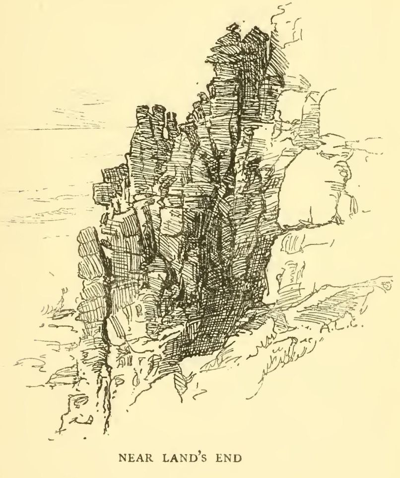 It is not necessary, I hope, to describe the Land's End as the county's best "asset" or as the "goose that lays the golden eggs", or by some such abominable phrase, which is yet well understood by all since it appeals to the baser nature in every man—to his greed and his cunning; still, it might be well to remind even those who are wholly concerned with material things that the sentiment they make light of probably exists in some degree in a majority of the inhabitants of this country—which, be it remembered, is mainly Anglo-Saxon, a sentimental race, to use the word in its better sense—and that it is the desire of most persons to see the Land's End; also that probably nine of every ten visitors to Cornwall think of that headland as their objective point.