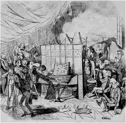 Il résulte de ce système général de rafraîchissement, en grand honneur à la Chaumière, un tumulte, un délire, un vacarme dont rien ne saurait donner une idée. C'est un concert de huées, de clameurs furibondes, de chants bachiques et autres, de bouteilles brisées, de verres choquant les tables, à se croire transporté dans quelque corps de garde de soudards ivres, ou au milieu d'une horde de frénétiques.