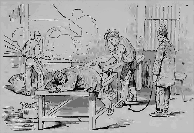 Les trois quarts de la vie des forçats se passent dans une salle semblable à celle où se fait cette opération, et que représente notre dessin. Pendant une partie de la journée, ils travaillent au grand jour, en plein air, avec des hommes libres. Si pénible qu'elle soit, cette fatigue leur est salutaire; mais, le soir, on les renferme dans ces tristes salles. La nuit venue, ils y sont enchaînas sur un lit de bois, les uns contre les autres, par une tringle de fer, sans pouvoir faire un seul mouvement...