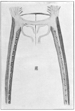 One of the first extensive accounts of these animals which also included quite a consideration of the nervous system was McIntosh in 1874. Several of the genus Nemestes were studied and the general form of the nervous system shown. Amphipheris is shown in a similar manner with a single lobe of the brain and with the two brain commissures. Tetrastemma is shown in a similar manner. Hubrecht in 1887 has an extensive paper in which the details of several nervous systems are shown as they show in reconstructions from sections. Eupolia girardi is especially well shown with its small dorsal and large ventral commissure and with three brain lobes. It is in this paper that Hubrecht makes his interesting comparison between the nemertians and cordates. In his paper of 1880 he has shown the structure and position of different parts of the nervous system of nemertians, especially of Cerebratulus of which he gives a very good figure. In this he shows a reconstruction of the brain with its chief nerves, ventral and dorsal commissures, general position of the cells, the two lobes of the brain on each side and the chief nerves. He also treats of nemertian nervous systems of many other forms, but not in so much detail.