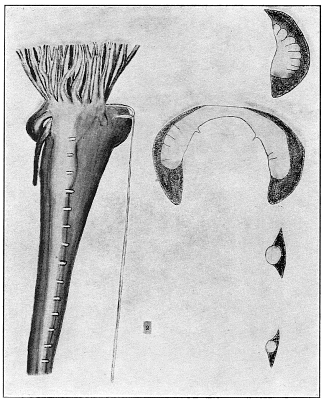 Figure 2 in the larger drawing at the right shows the nervous system as viewed from the side with the dorsal side to the left. The central core of the ganglion and cord is to indicate the position of the fiber area. The small drawings at the left show various levels of the nervous system as seen in cross section. The ventral side is up. The drawing at the top is through the brain before the commissures are reached, the next lower is through the thickest part of the brain and the lower two drawings are through one of the lateral cords.