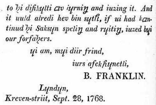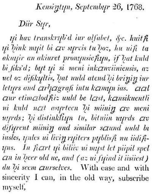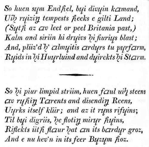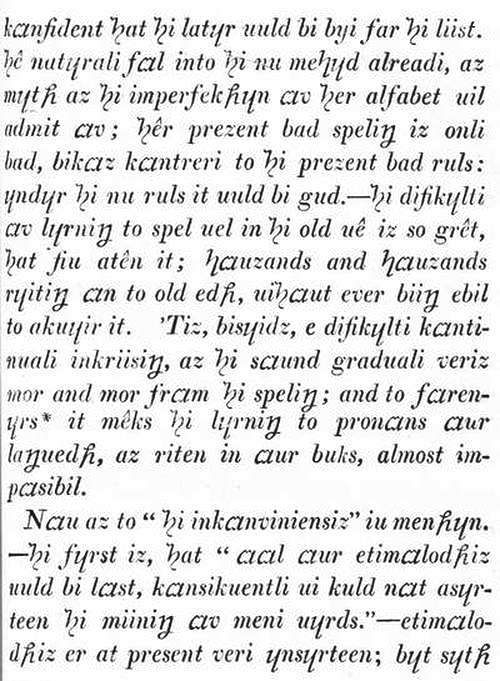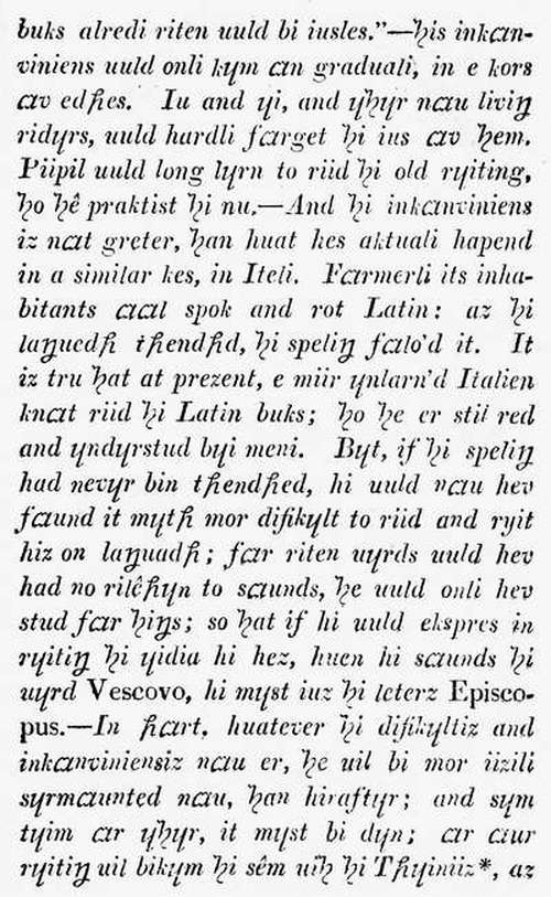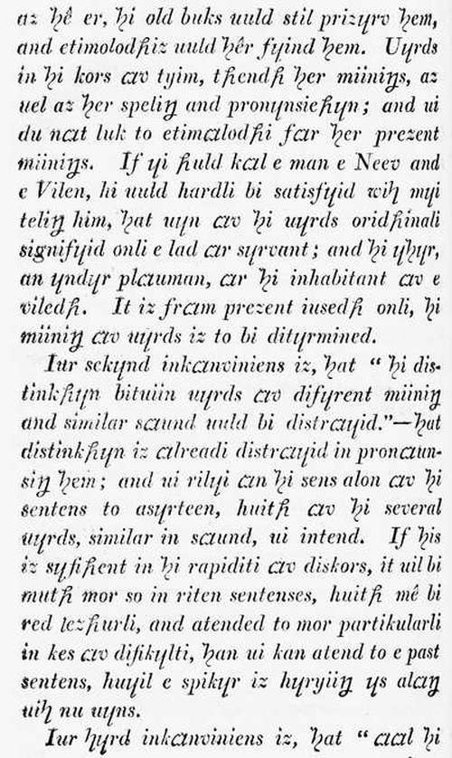 Several pages of the book contain a description and examples of a modified alphabet proposed by B.F. There are six new characters in his alphabet; these, and the example text using them (pages 360-366 in the original book) are shown as images in this ebook.