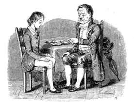 Mein Lehrer war doch, wenn ich es recht bedenke, ein drolliger Mann: brav und pedantisch, ehrbar und komisch, ernst und lächerlich, so daß er auf mich zu gleicher Zeit einen Ehrfurcht und Lachen erregenden Eindruck machte. Die Gewalt strenger Ehrbarkeit, der Einfluß strenger Grundsätze ist aber, wenn das eigene Benehmen ihnen nicht widerspricht, so groß, daß Ratin trotz des wahrhaft lächerlichen Eindruckes, den er auf mich machte, eine weit größere Gewalt über mich übte, als mancher weit geschicktere oder tüchtigere Lehrer, bei dem ich aber den geringsten Zwiespalt zwischen den Vorschriften, die er mir aufstellte, und denen, die er selbst befolgte, bemerkt hätte.