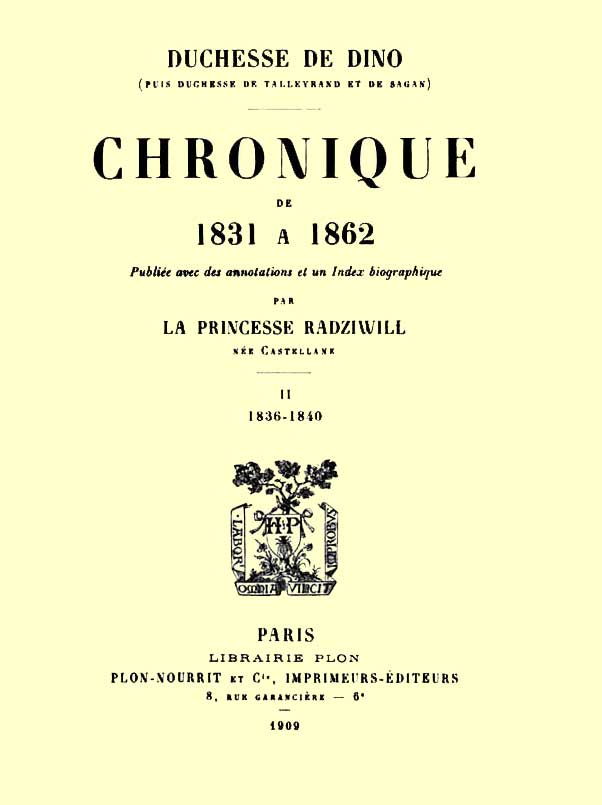 Paris, 27 mars 1836.—Hier matin, j'ai eu l'honneur de voir le Roi chez Madame Adélaïde; il a eu une conversation charmante. Il a eu la bonté de me raconter son mariage, la Cour de Palerme, et la fameuse Reine Caroline. J'ai su, aussi, que le prince Charles de Naples et miss 31 Pénélope arrivaient ici dans deux jours, pauvres comme des gueux. Cette arrivée est un embarras, et une sorte de honte, surtout pour la Reine [14].