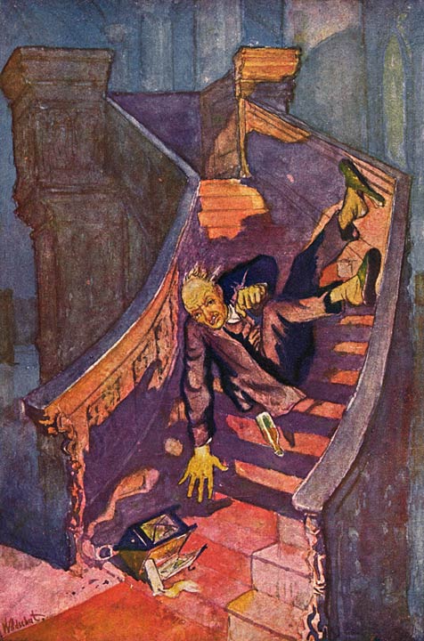Mevrouw staarde hem aan, zenuwachtig omdat hij zoo raar deed. Ze dacht al bij zich zelf: Waar staat de geest van zout, of de eau de cologne!