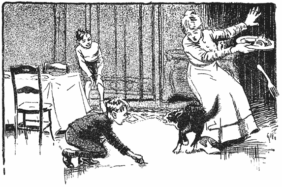 „’k Doe ’t jou na,” antwoordde zij, en uit pure boosheid gaf ze de poes ’n duw, zoodat ’t beest uit z’n humeur raakte en in ’t kozijn ging zitten piekeren.