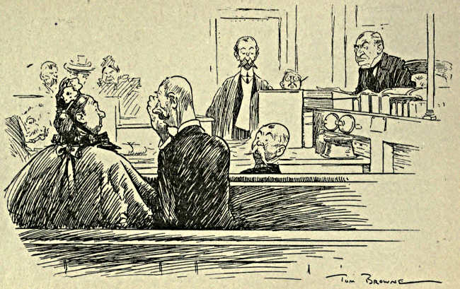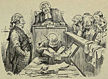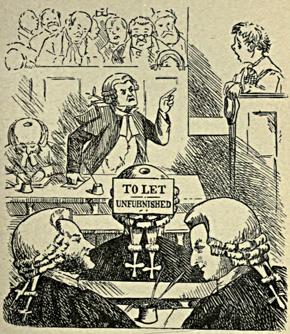 Mr. Punch has done his share towards bringing about various law reforms. We find him hammering away continually for many years at the Law’s delays, its costliness, its inconsistencies, and the evils he has satirised, the inconveniences he has laughed at have largely been remedied. He makes fun of the jesting judge and the bullying barrister, while he is genially amusing at the expense of the timid and blundering witness, and the youthful vanity or elderly pomposity of members of the bench and bar. He is rightly bitter now and then when he touches on the comparatively light sentences inflicted on audacious, but wealthy, swindlers, and the comparatively heavy penalties exacted from lesser, poorer, and more ignorant burglars and pickpockets; but in the main he devotes himself to the lighter side of law and justice and the professions that are concerned in its administration.