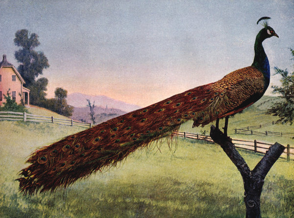 Peacocks are very jealous of all quadrupeds, especially of dogs. When they are discovered in a tree situated on a plain, if a dog is loose and hunts near it, the birds will rarely move but will show extreme uneasiness. One of these birds in the north of Ireland was a curious mixture of cruelty and fun. He had four mates but he killed them all successively by pecking them to death, for what cause no one could ascertain. Even his own offspring shared the same fate, until his owner placed the peafowl's eggs under a sitting hen and forced her to hatch the eggs and care for the young. His great amusement was to frighten the chickens. There were two iron troughs in which the food for the chickens was placed daily. No sooner had they gathered about them, when the peacock would erect his train, rattle his quills together with that peculiar rustling sound that is so characteristic of these birds, and march slowly toward them. The poor little chicks would slowly back away from the troughs as the peacock advanced, not wishing to lose sight of the food yet not daring to remain in defiance of their persecutor. By degrees [Pg 101] he got them all into a corner, crouching together and trembling when he would overshadow them with his train, place the ends of the feathers against the wall so as to cover them, rattle his quills, in order to frighten them, and then strut off proud of the trick he had played. He did not care for the food which he left untouched.