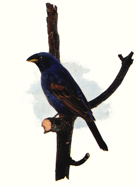 For all this his changeable suit is not only becoming, but decidedly modern—warp of blue and woof of green that change with changing light from indigo to intense emerald. Then there are browns and drabs in striking contrasts—colors worn by indigoes while young and inexperienced, the confused shades of the upper breast replaced by sparrowy stripes beneath.