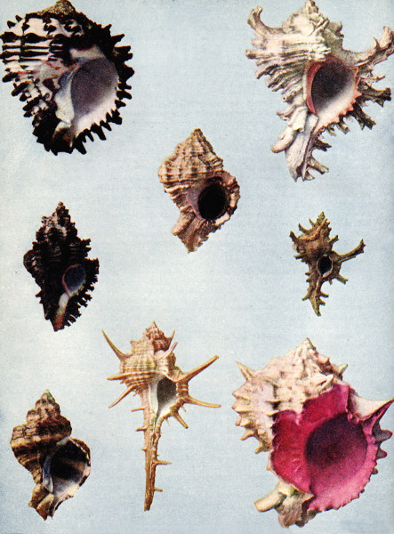 There are shown on the plate eight species of rock shells, all more or less common. The first one for us to consider may be called Venus' Comb, (Murex tribulus) and is found in China, Japan and the Indian Ocean. It belongs to a group of shells which is characterized by a long snout or canal, and long, pointed spines. The color is yellowish; in one variety the spines are tipped with black.