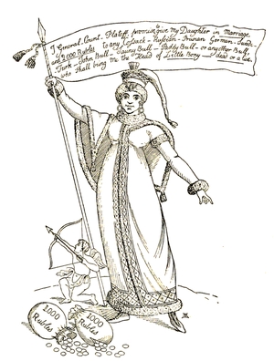 In February, 1815, there was a widespread belief in the existence, in London, of such a monstrosity, and she is depicted in this illustration which is called "Waltzing a Courtship." There is also another engraving of her, showing her seated playing the piano, but very thinly veiled, so that her porcine countenance is plainly visible. I believe there is also another, but this I have not seen, where she is seen standing by a table, on which is her silver feeding-trough.