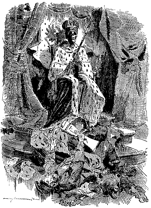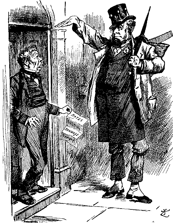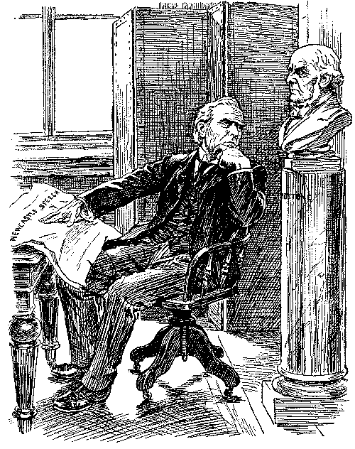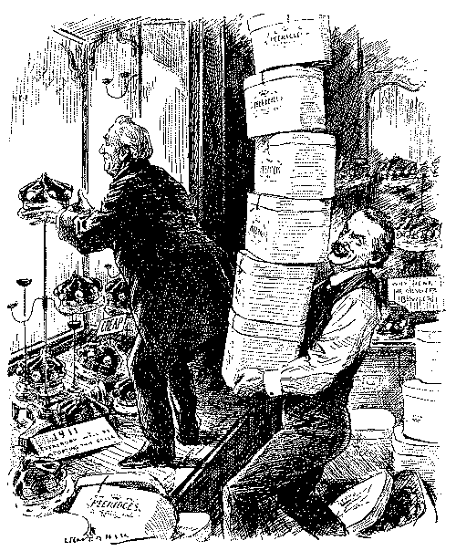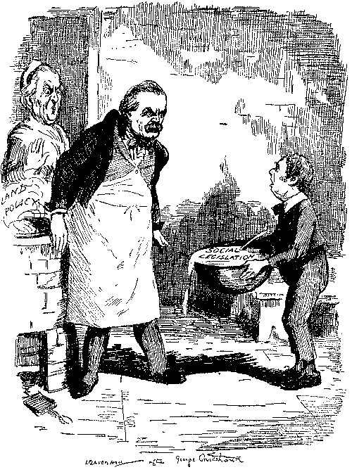 In the "Essence of Parliament" little is said of the arguments, but we get a glimpse of Lord Randolph Churchill's return to the political arena and echoes of the unbridled loquacity of Mr. Sexton. The cartoons are more instructive, notably that on the introduction of the "Guillotine" by Gladstone, with the G.O.M. as chief operator, Harcourt and Morley as republican soldiers, and Amendments, as heads, falling into a waste-paper basket. The fate of the measure is neatly hit off in the "Little Billee" cartoon; Home Rule as "Little Billee" is about to be massacred by the House of Lords, represented by Salisbury and Hartington as chief villains. "Little Billee" in the legend not only survived but attained high distinction in after life; but it is hard to say whether Punch implied a similar resurrection for the Bill of 1893. But whatever were his views on the merits of Home Rule, Punch was decidedly critical of the Government's naval policy, and when Mr. Gladstone and Mr. Morley had simultaneously made seemingly irreconcilable speeches on the subject, he adroitly invoked the shade of Cobden, who had, in certain conditions, proclaimed himself a Big Navyite. Punch fortified the argument by a set of verses headed "Rule Britannia" and ending with this stanza:—