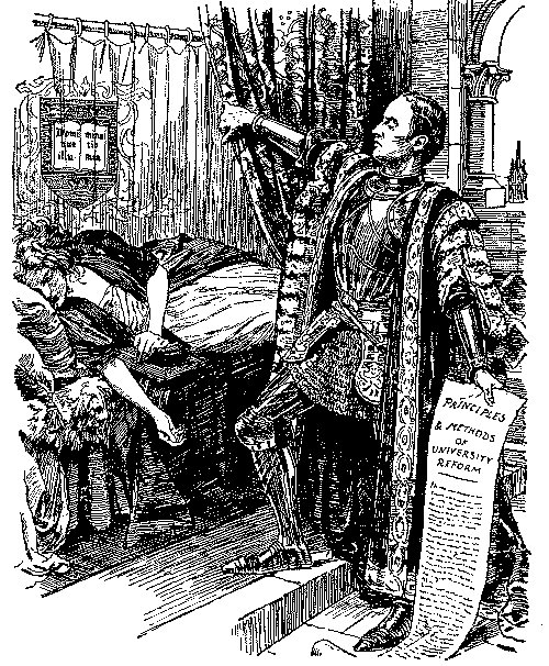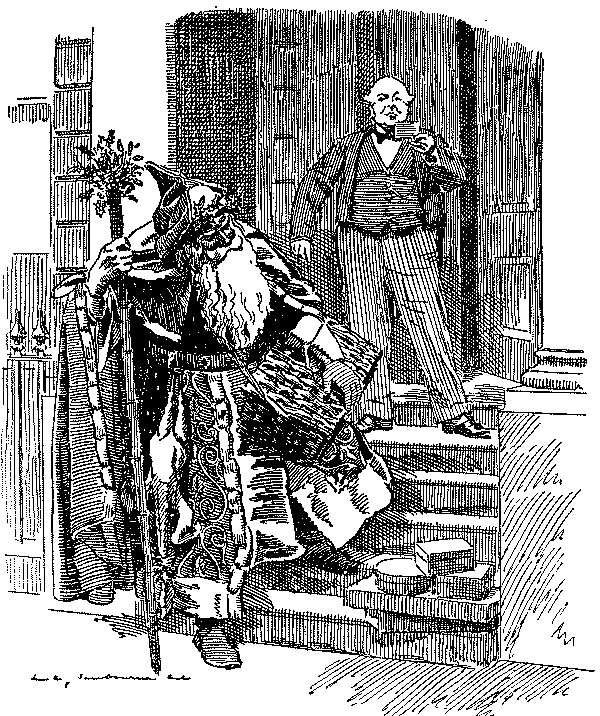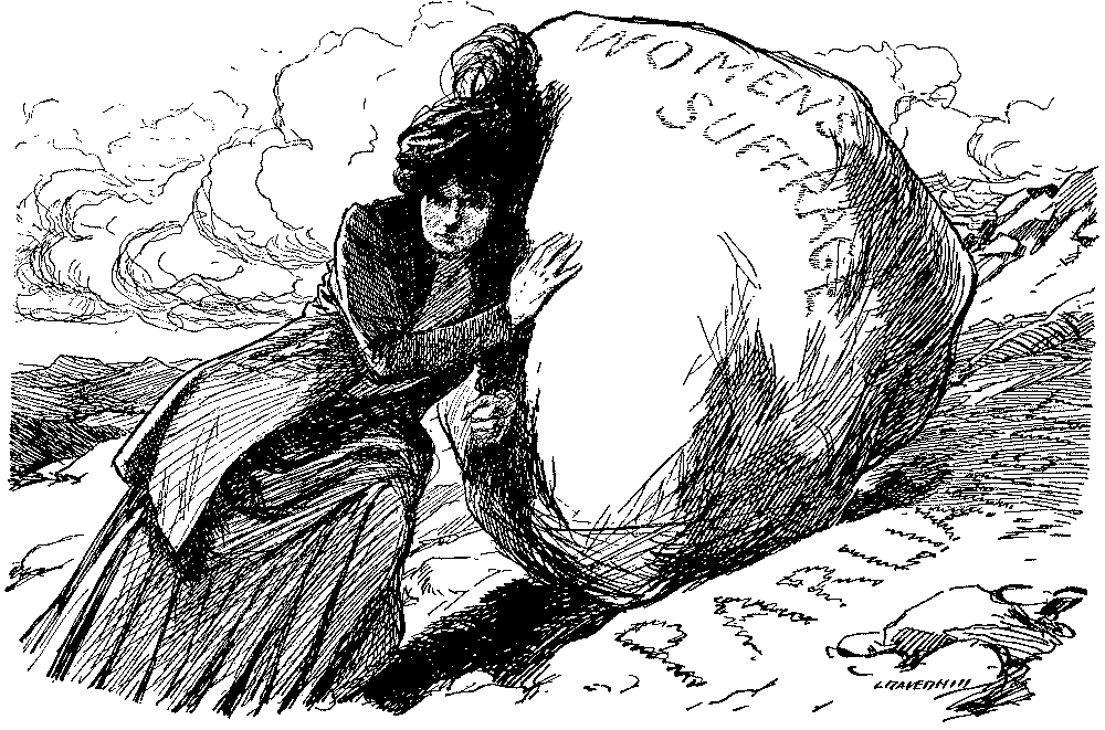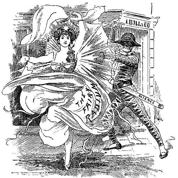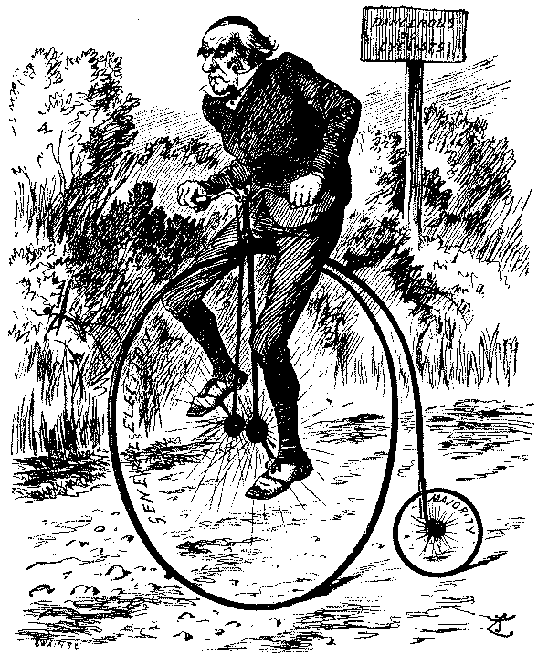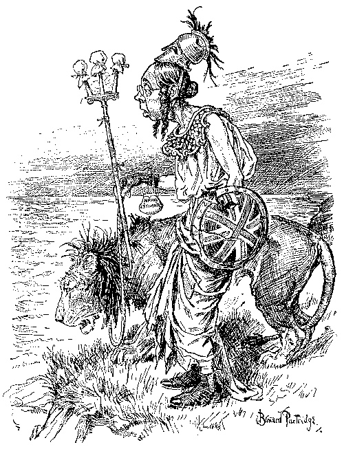 To turn from outlines to details, one is confronted in 1893 with Mr. Gladstone's second attempt to solve a problem which Giraldus Cambrensis pronounced insoluble seven centuries ago. Punch's earlier cartoons on the Home Rule Bill are negligible, but the difficulties of the Premier's position are aptly shown in the picture of Gladstone as a knight in armour on a perilous pathway between the Irish Nationalist bog and the "last ditch" of Ulster. The accompanying text, modelled on Bunyan, represents Mr. Gladstone as a Pilgrim relying as much on tactics as the sword. The most genial reference to Ulster is that in which she figures as the Widow Wadman asking Uncle Toby, "Now, Mr. Bull, do you see any 'green' in my eye?" and Uncle Toby protests he "can see nothing whatever of the sort." Otherwise Punch's attitude is unsympathetic, witness the use of the term "Ulsteria" and the epigram on the second reading of the Bill, put, it is true, into the mouth of "A rebellious Rad":—
