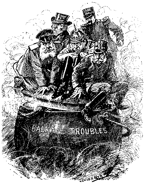 Confronted on all sides by problems of such magnitude and far-reaching importance, it is not to be wondered at if Punch—primarily a comic journal—failed to gauge their full significance, or to preserve an attitude of inflexible consistency in his comments. There was always a certain divergence between his editorial policy as expressed in the cartoons and the comments of individual members of his staff. This elasticity made for impartiality in the main; but it became somewhat perplexing[Pg 11] at the time of the Boer war, when a general support of the Government was combined with very sharp criticism of Lord Milner. Yet if Punch here and elsewhere spoke with more than one voice, his views on high policy, international relations and home affairs exhibit a certain general uniformity and continuity. He supported both the Entente and the alliance with Japan. The spasm of irritation over the Fashoda incident soon passed; he resented the intervention of Russia and Germany which robbed Japan of the fruits of her victory over China, and his sympathies were unmistakably with Japan in the war with Russia. Punch was consistently and increasingly critical of the Kaiser, while perhaps over-ready to dissociate his temper from that not only of the German people but of the educated classes; he was also consistently alive to the menace of German competition in naval armaments and trade, though by no means disposed to acquit British merchants and workmen from a provocative lethargy. Towards America, Punch's attitude shows a progressive benevolence. The Venezuela incident and President Cleveland's message at the beginning of this period brought us within measurable distance of a rupture, happily averted by negotiation, as the later and less serious difficulty over the Alaska boundary was averted by arbitration. One may fairly say that Punch's relief at the pacific adjustment of these outstanding questions was far greater than his sensitiveness on the point of national honour. He did not refrain from the use of the word "filibustering" in connexion with the Spanish-American war, in which the gallantry of Cervera went far to enlist sympathy on the beaten side; but with the accession to the Presidency of Mr. Roosevelt, a man in many ways after Punch's own heart, though not exempt from criticism for his controversial methods, a friendlier tone became apparent, and the historic "indiscretion" of Admiral Sims's speech at the Guildhall in 1910 helped to create the atmosphere of goodwill which rendered possible the fulfilment of his prophecy.