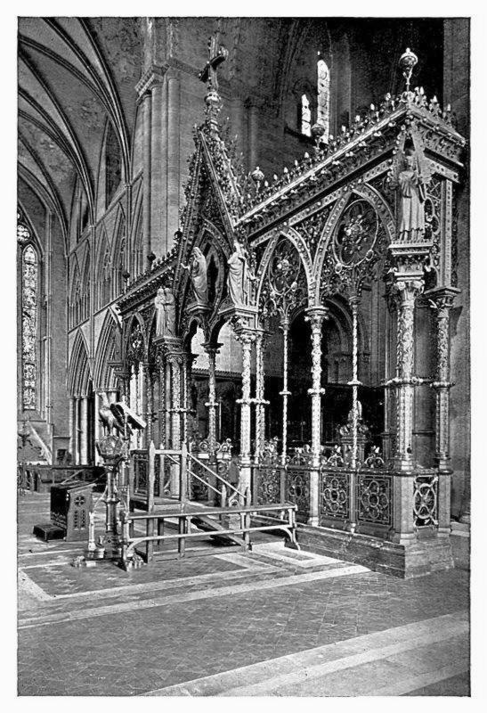 His desire was that his bones should be laid to rest in his own Cathedral Church in far-away England, so, as it was an almost impossible task to convey a dead body across Europe in those days, do you know what his followers did? They boiled his body, until the flesh separated from the bones; then they buried the flesh in the Church of St. Severus near Florence, and the bones, which were now quite easy to carry, they brought to Hereford, and buried them in the Lady-chapel. They were afterwards removed to a little chapel known as the Chapel of St. Catherine, and at last this beautiful shrine was prepared for them, and they were placed inside.
