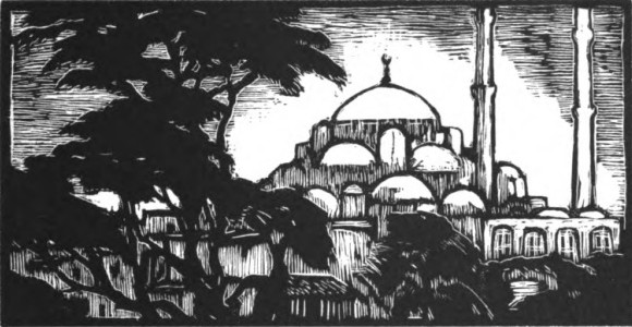 Le soir, changement de décor. Les corvées diplomatiques et mondaines bâclées, le chirket haïrié me remporte, sur un Bosphore crépusculaire inexprimablement doux et recueilli, vers Stamboul dont le profil dentelé frange le couchant rouge d'une légion de petites lances bleuâtres,—les minarets des cinq cents mosquées.