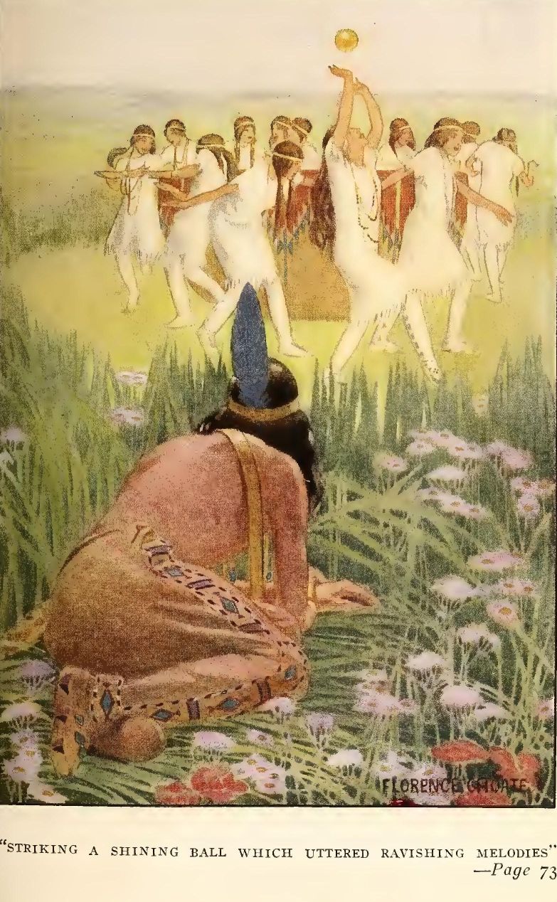 The beautiful stranger was richly and gaily dressed, having on a great many garments of green and yellow colors, but differing in their deeper or lighter shades. He had a plume of waving feathers on his head, and all his motions were graceful, reminding Wunzh of the deep green of the summer grass, the clear amber of the summer sky, and the gentle blowing of the summer wind. As Wunzh gazed at his visitor, he paused on a little mound of earth just before the door of the lodge.