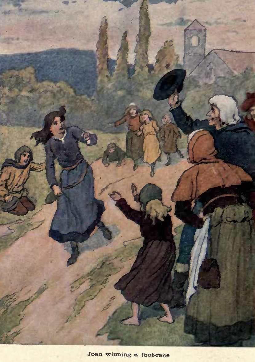 WHEN Joan was about thirteen a very wonderful thing happened to her. One day she and the other girls and boys were running a race for a crown of flowers. Joan was easily the winner, and as she was running, a child who was looking on cried, “Joan. I see you flying along without touching the ground.” After the race Joan had a curious feeling as if she did not know where she was and then heard a young man’s voice near her bidding her go home, for her mother needed her. She did not know who spoke; she thought it might be her brother, or one of her neighbours, so she ran home. She found that her mother had not sent for her, and she was going back to her friends, when a bright light like a shining cloud appeared to her, and a Voice told her to go and save France from the English. Till that hour she had been sorry for the sorrows in France, but as she was only a little girl, she had never thought that she could lead an army against the English.