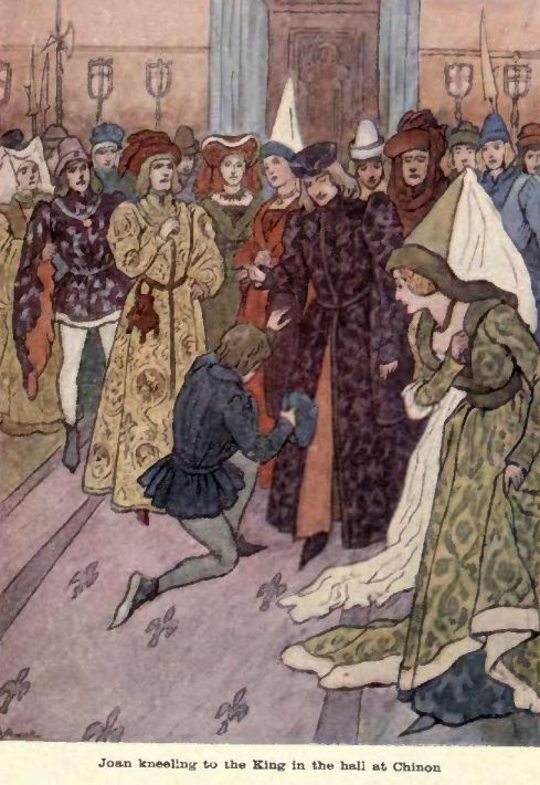 WHEN Joan reached Chinon, she was lodged with a lady who was very kind, and she waited to see the Dauphin. His advisers were not sure that he ought to see the Maid at all; but probably he was curious, and at last she was brought to the castle, and led up the stairs to a great hall, where were many men in splendid dresses. The castle is in ruins now, and the hall has no roof over it, but you can still go in and see the walls, and empty windows, and the great fireplace. A man plainly dressed was in the crowd of magnificent courtiers in silk and gold embroidery. Joan went straight up, and kneeling on one knee, said, “Fair Sir, you are the Dauphin to whom I am come.” But the man pointed to a knight, very richly dressed, and said, “That is the King.”