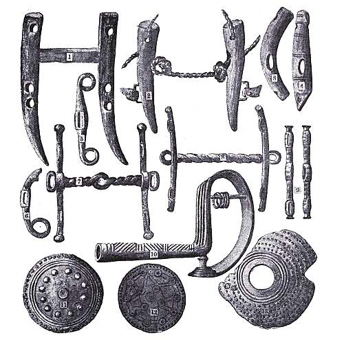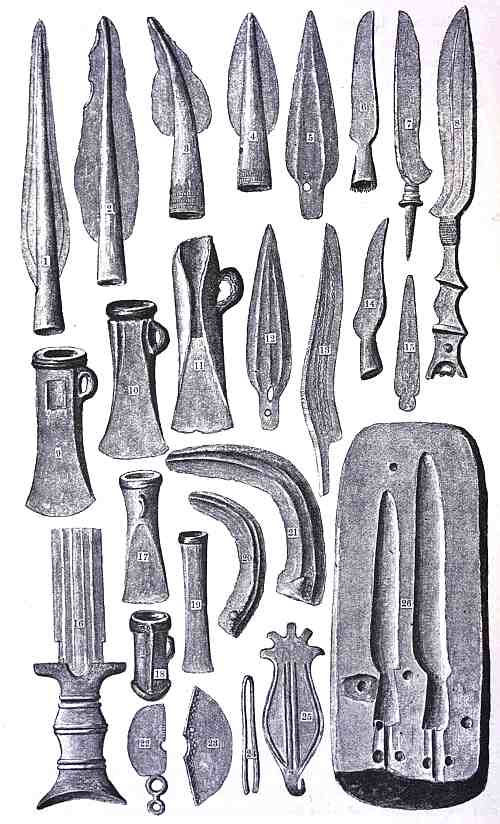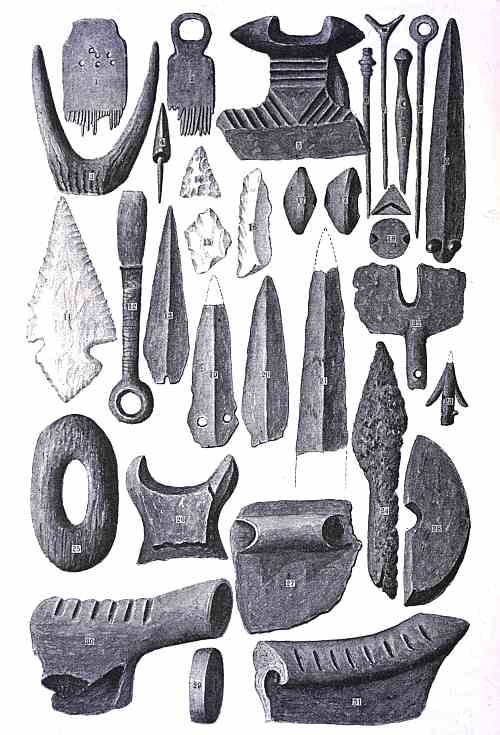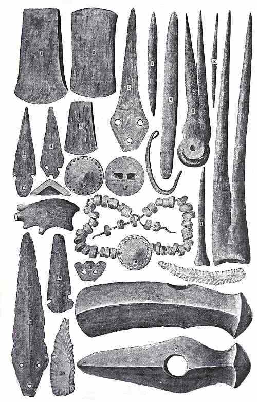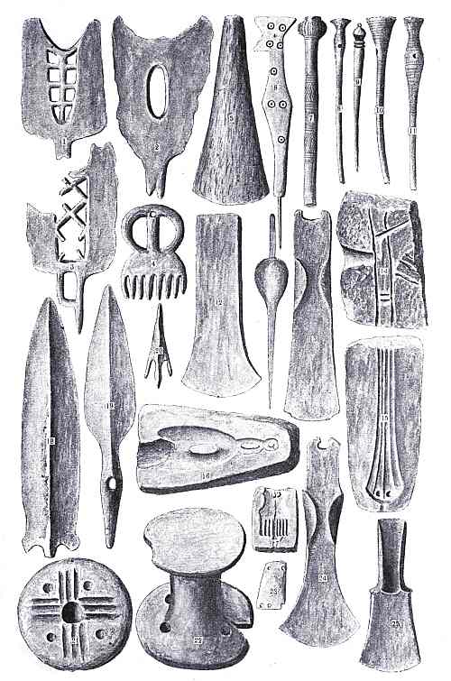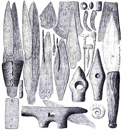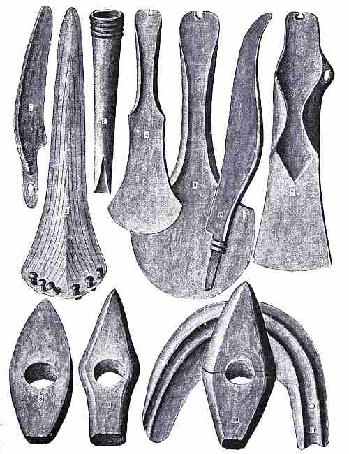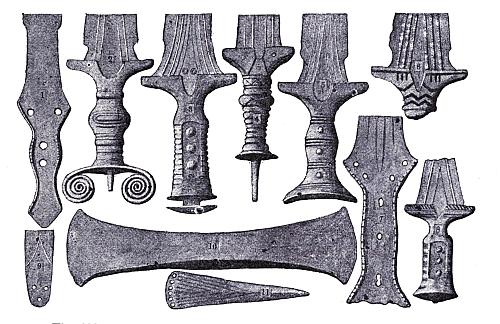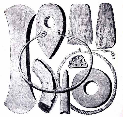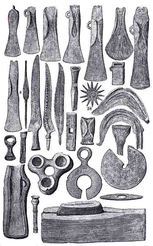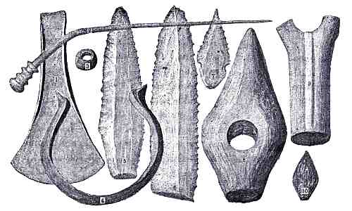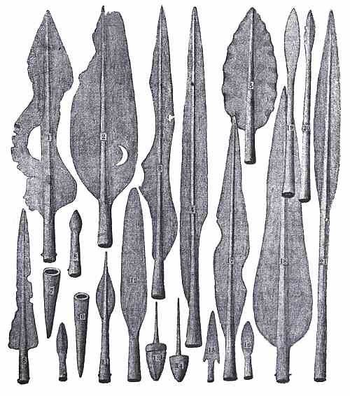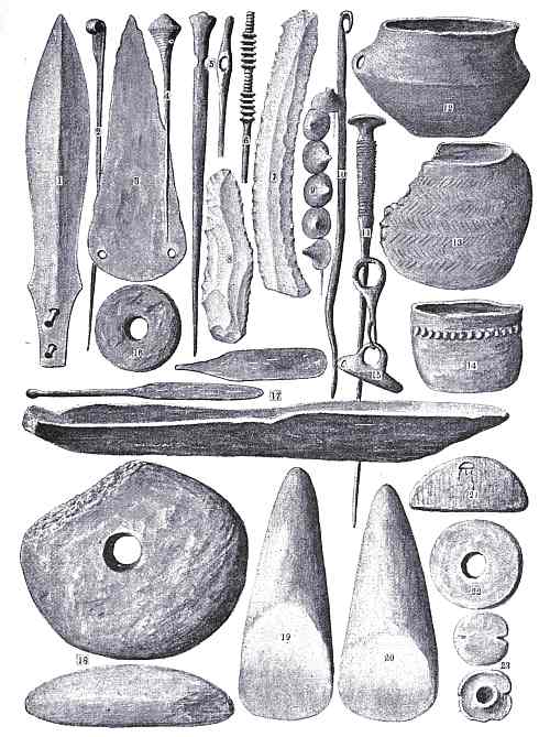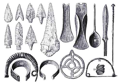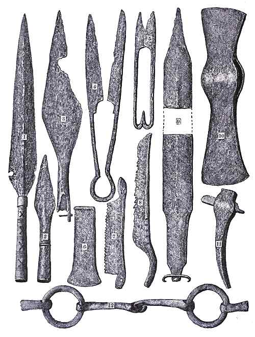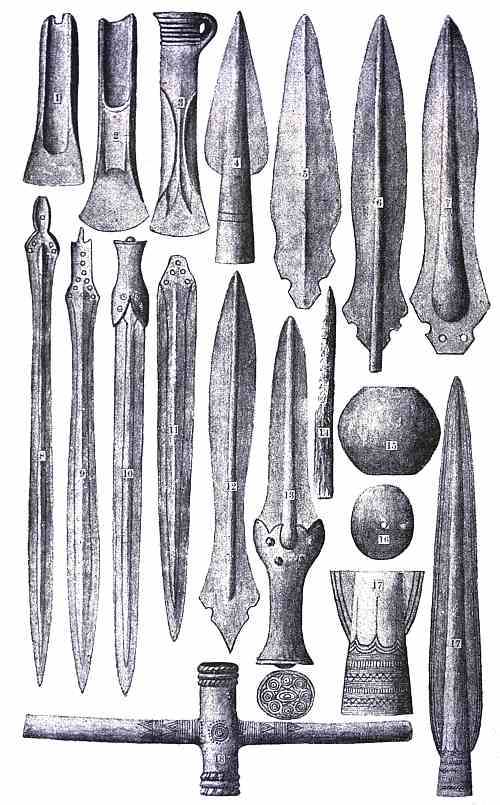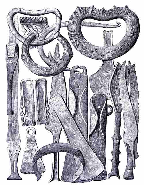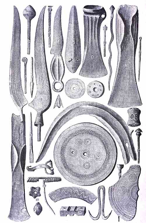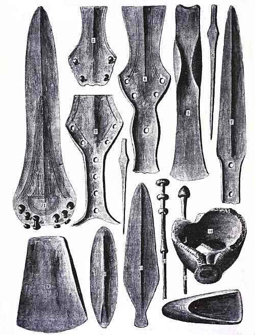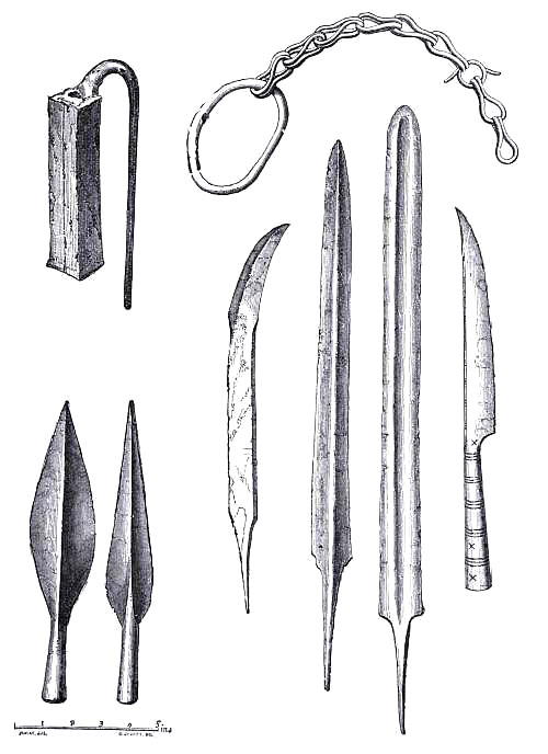 [92] "Six stone and two bronze celts, an iron spear-head and a bayonet, three fibulæ, one bridle-bit and two cheek-plates made of bronze," found on this island.
