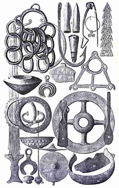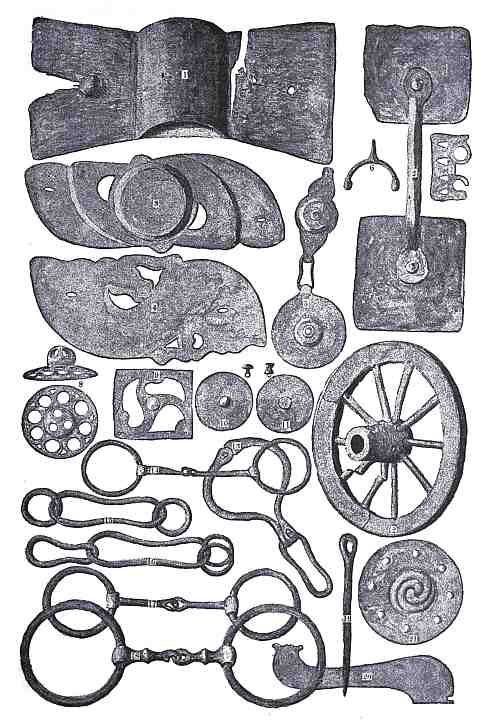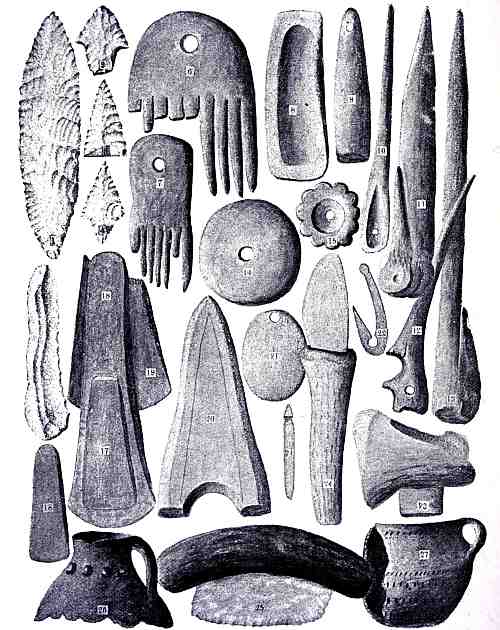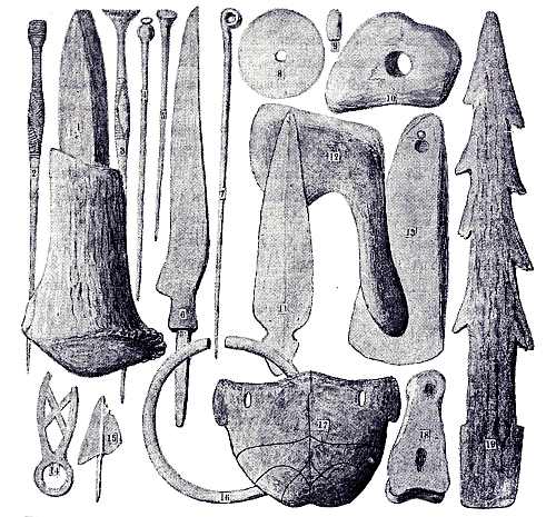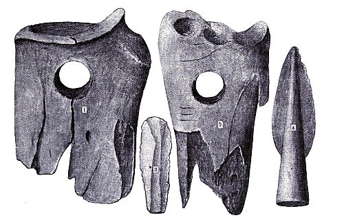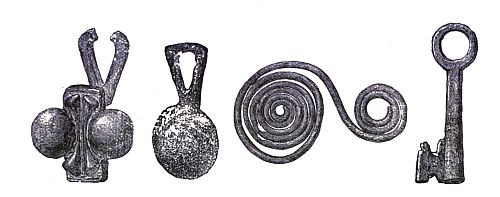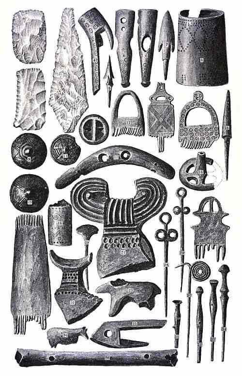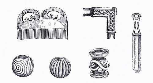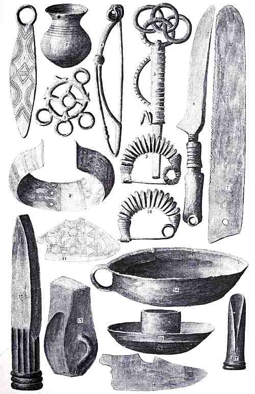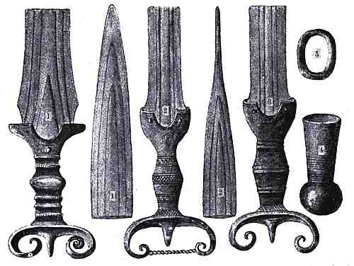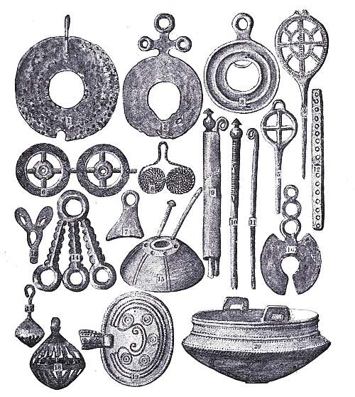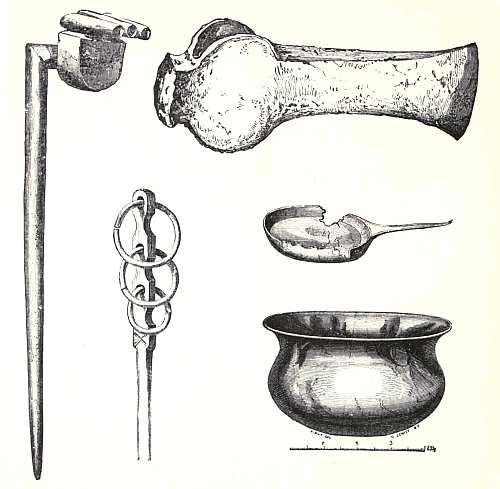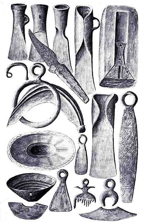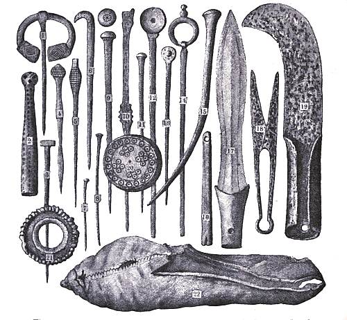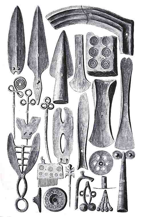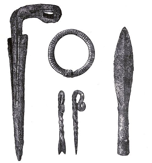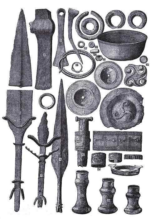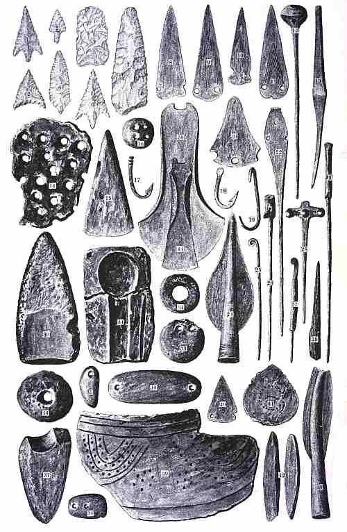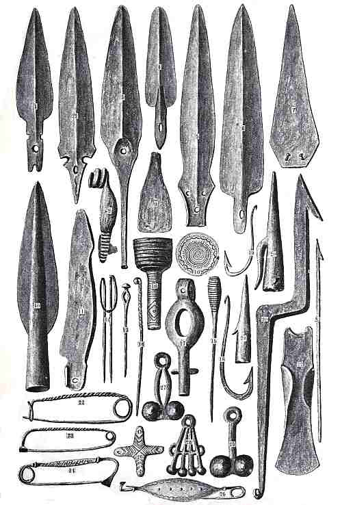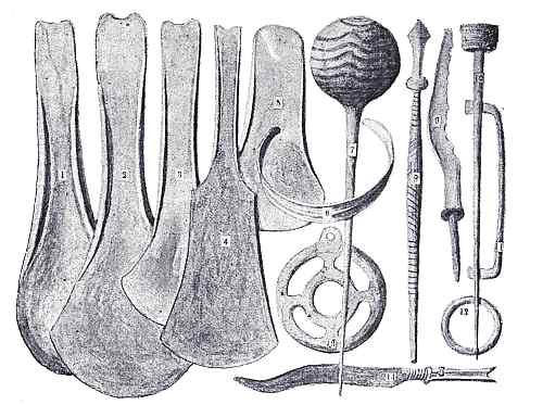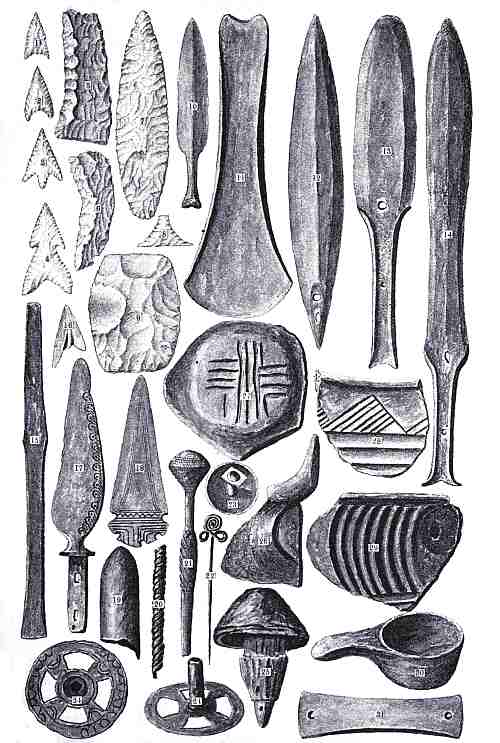 [92] "Six stone and two bronze celts, an iron spear-head and a bayonet, three fibulæ, one bridle-bit and two cheek-plates made of bronze," found on this island.