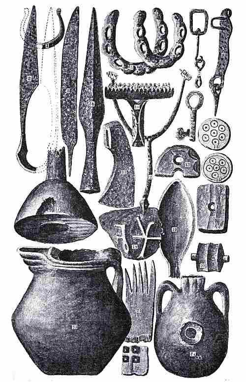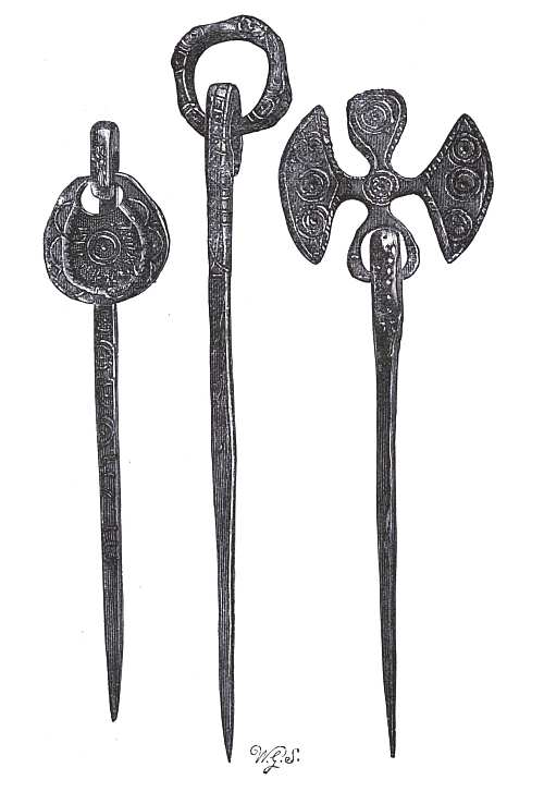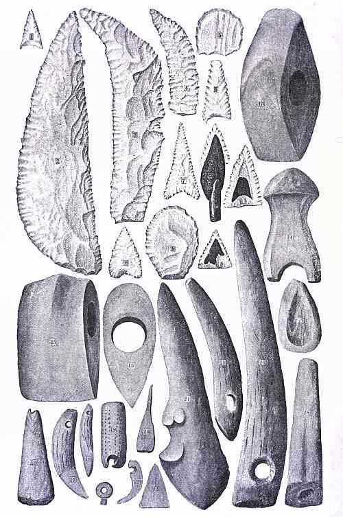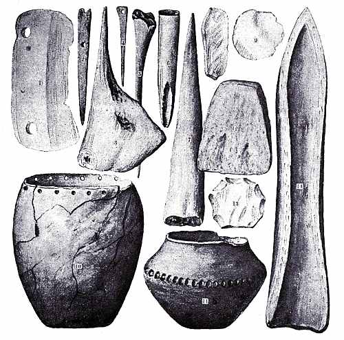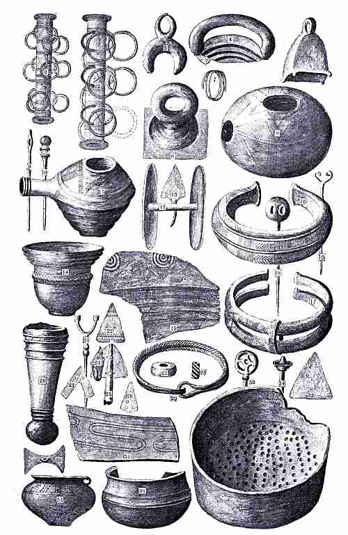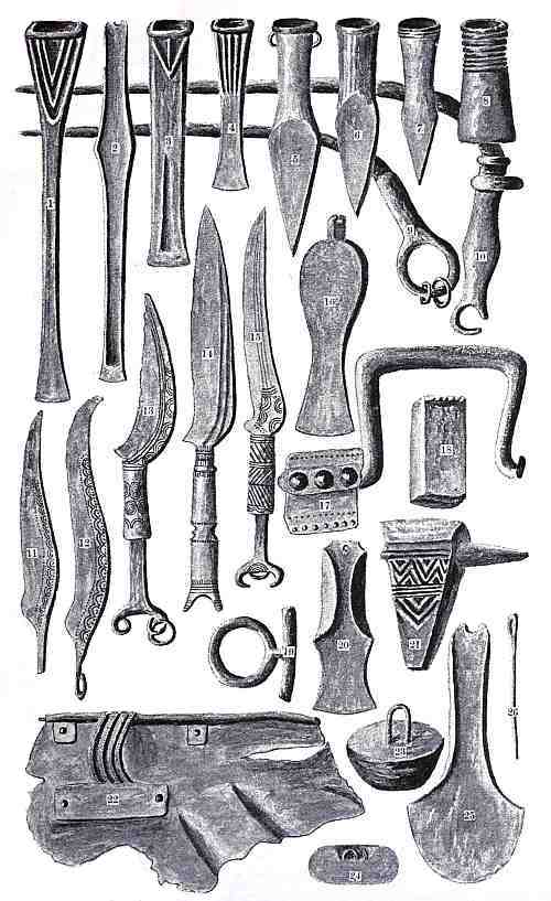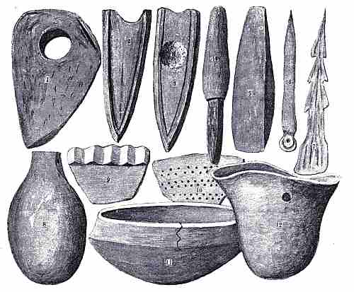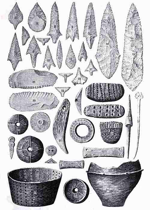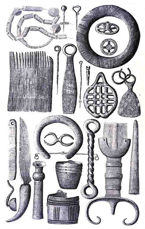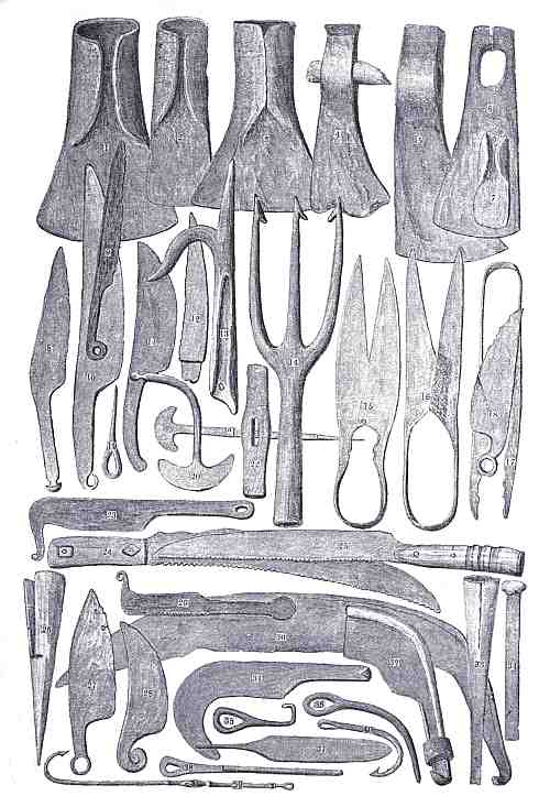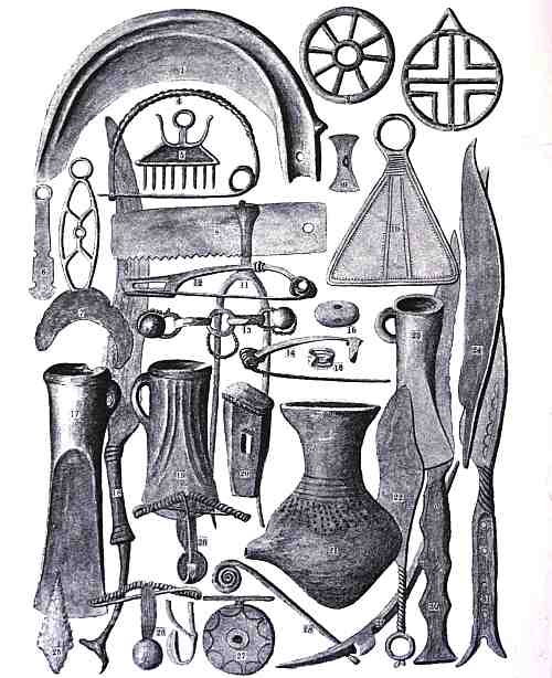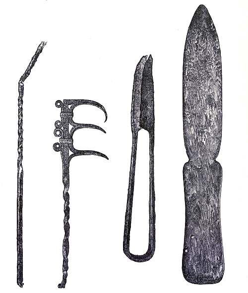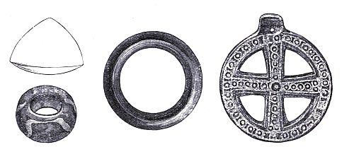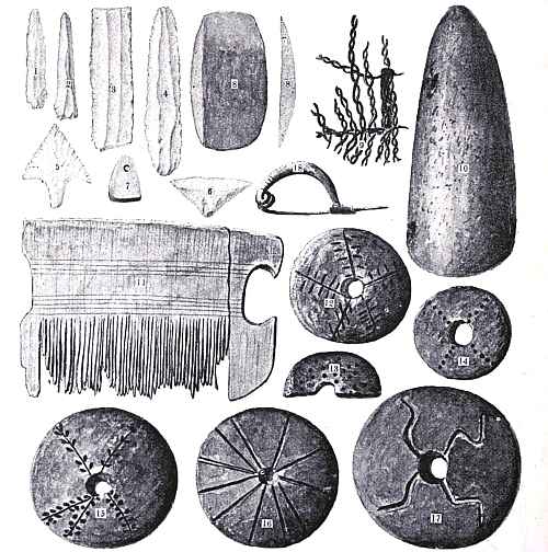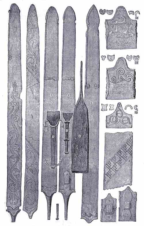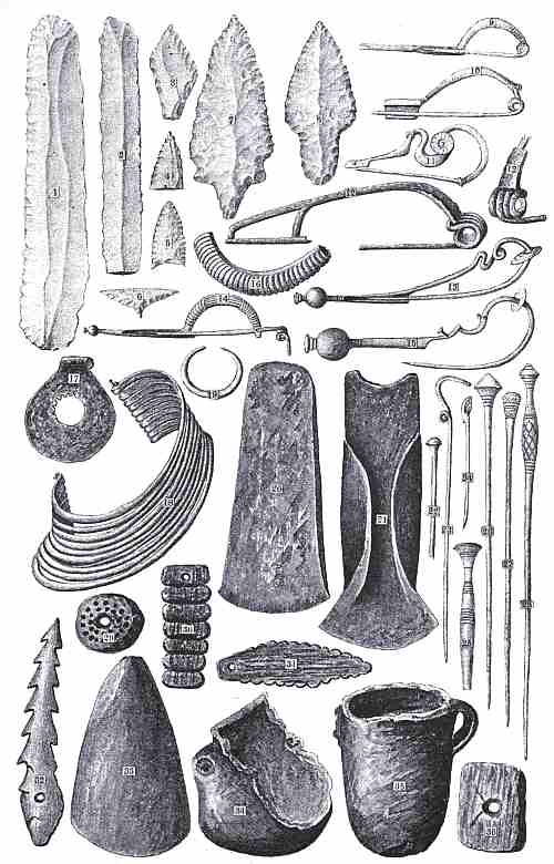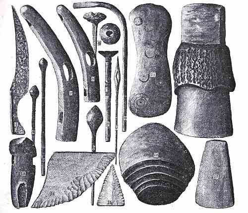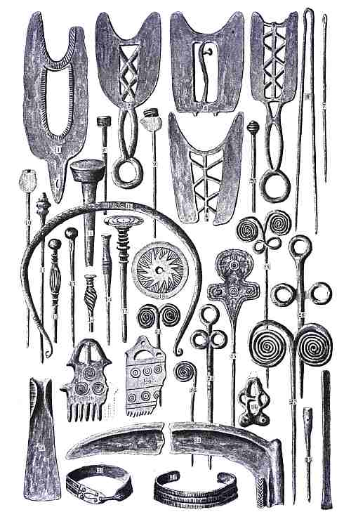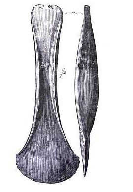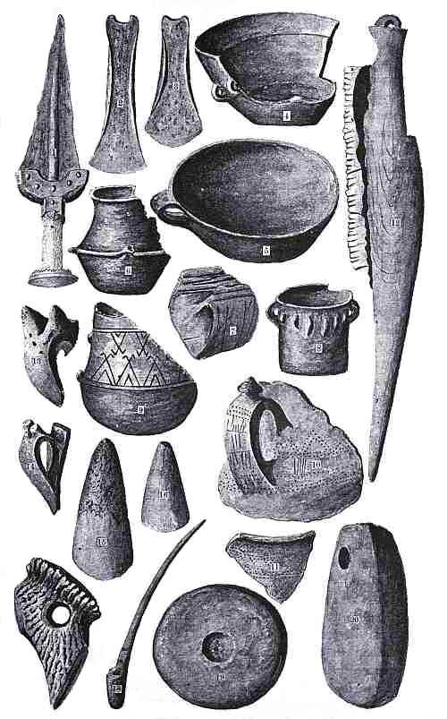 [92] "Six stone and two bronze celts, an iron spear-head and a bayonet, three fibulæ, one bridle-bit and two cheek-plates made of bronze," found on this island.