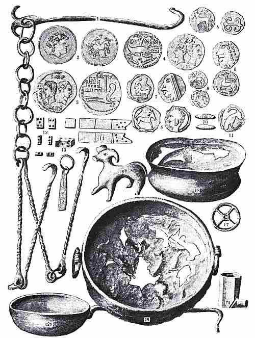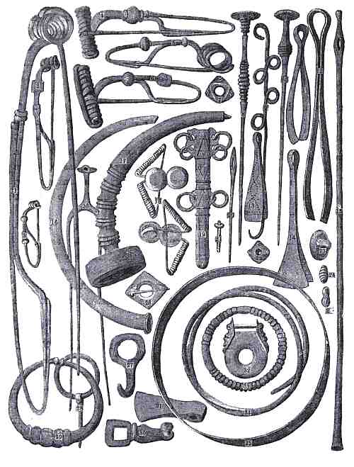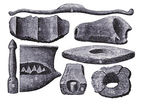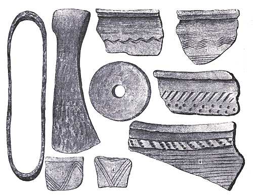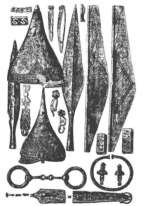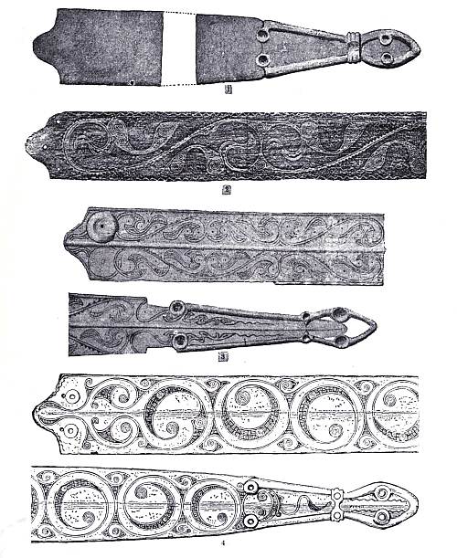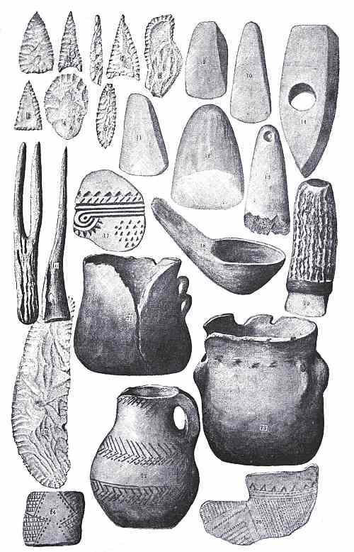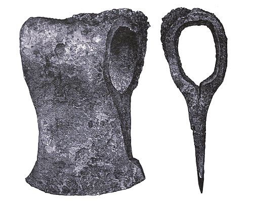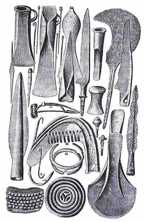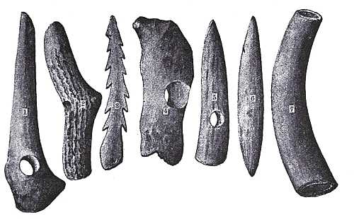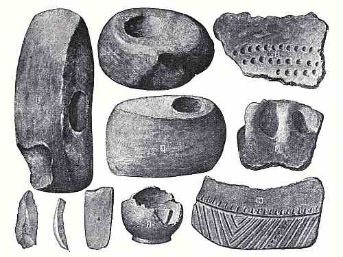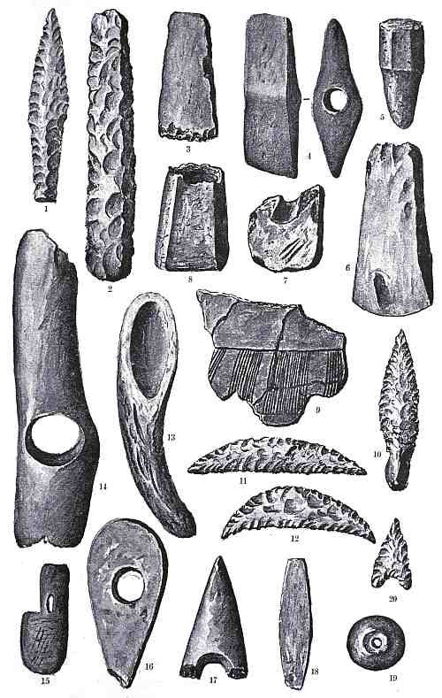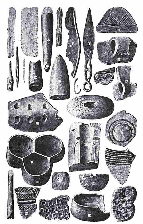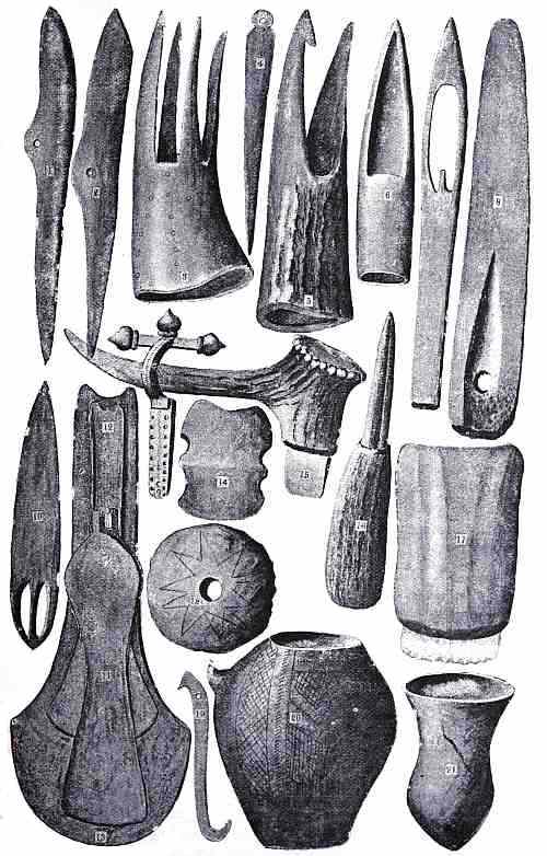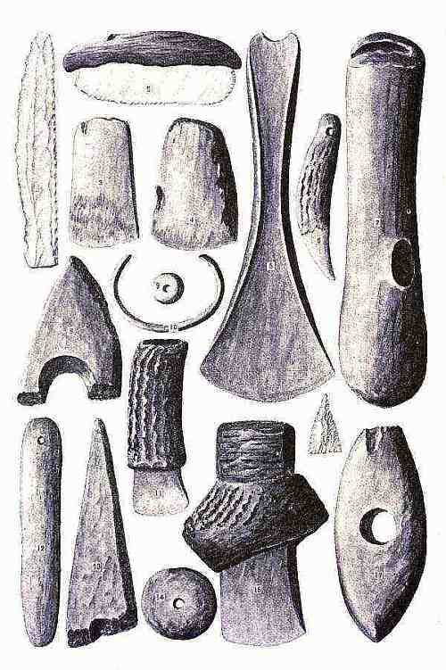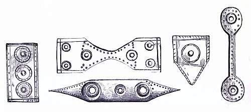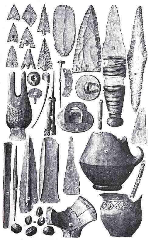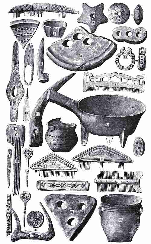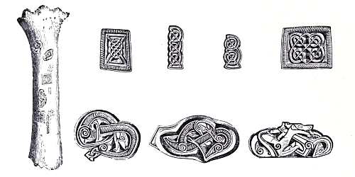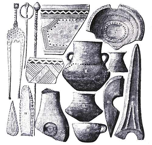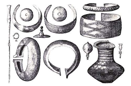 [92] "Six stone and two bronze celts, an iron spear-head and a bayonet, three fibulæ, one bridle-bit and two cheek-plates made of bronze," found on this island.