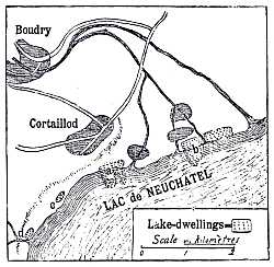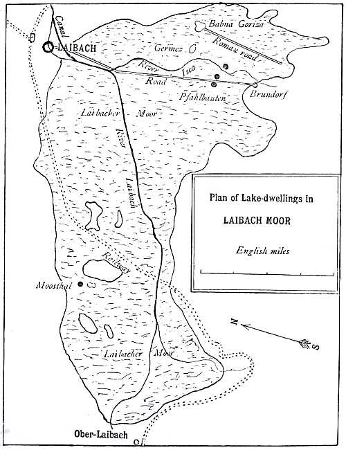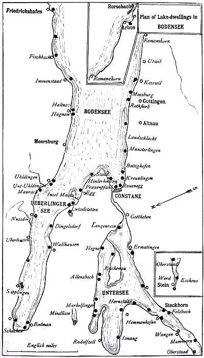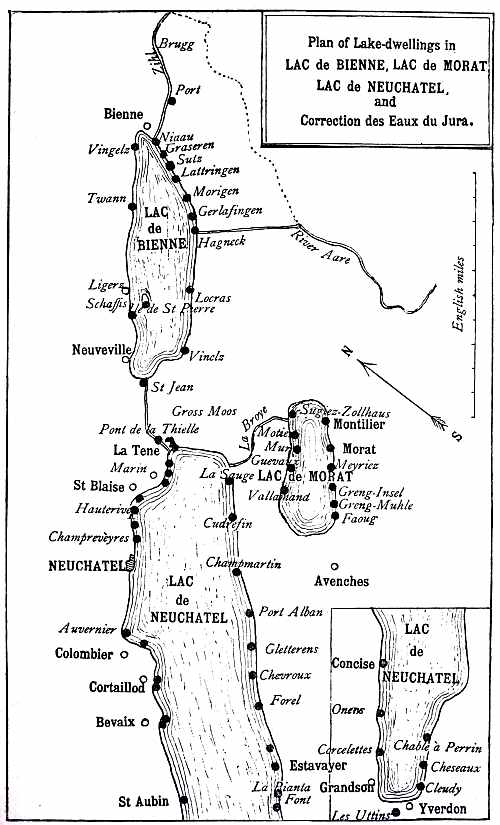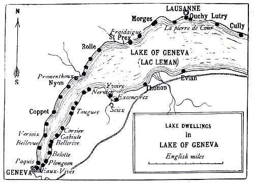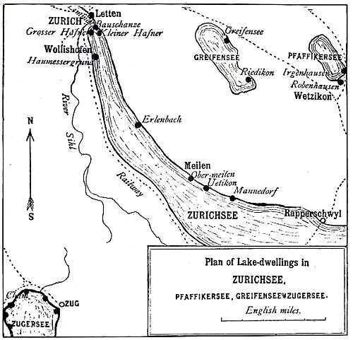 As our peripatetic labours drew to a close, the next point to be considered was the method of grouping the materials under six divisions, corresponding with the prescribed number of lectures. This was by no means an easy task, as neither the geographical distribution, nor the historical order of the discoveries, could be exclusively selected as a cementing element in dealing with remains so diversified in character and of so wide a range in space and time. The plan which I have here adopted seems to me to combine the greatest advantages with the fewest drawbacks. Its rationale is as follows:—After introducing my subject by a short account of the circumstances that led to the discovery of the Pfahlbauten in the Lake of Zürich, and glancing at the archæological importance and surprising results of this discovery in other Swiss lakes, the historical element is dropped, and I conduct my readers over Western Switzerland and Savoy, summarising the discoveries in the successive lakes as we move along. In the second lecture we again start near the same place and continue our explorations in an easterly direction, and having examined the Upper Rhine district we cross over to the great Danubian basin, which we follow downwards as far as the lacustrine trail carries us, and ultimately finish with Laibach near the source of the Drave. The third lecture is entirely occupied with the palafittes and terremare in the Po valley. In these wanderings we have virtually made a circuit of the great Alpine chain of mountains, and have seen that the habit of constructing lake-dwellings was prevalent in the upper reaches of the four principal waterways which diverge from its flanks, viz. the Rhine, Rhone, Danube, and Po.