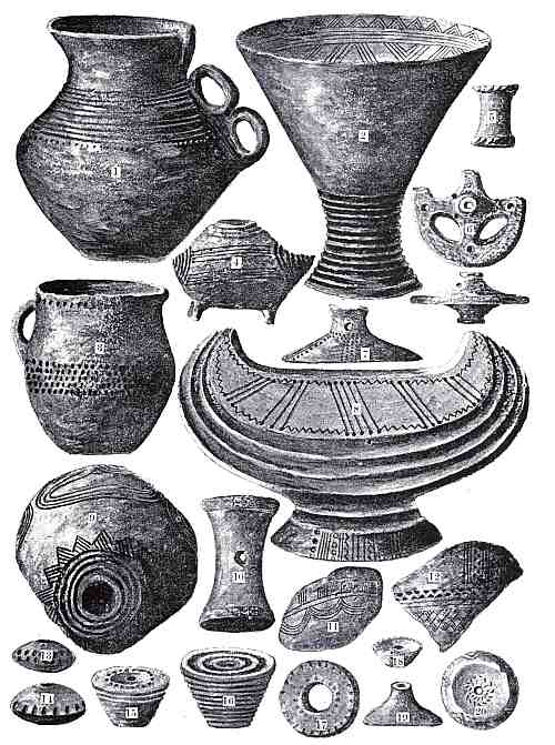 In these circumstances I resolved to proceed de novo, and to construct my story of the lake-dwellings from whatever trustworthy sources I could lay my hands on. In order to carry out this intention my wife and I perambulated the whole of Central Europe with note and sketch books in hand, visiting, as far as practicable, the sites of lake-dwellings, and searching museums and libraries wherever we thought their relics or records were to be found. The eastern limit of the region thus visited may be represented by a line drawn from Königsberg to Trieste, passing through the intermediate towns of Krakow, Buda-Pesth, and Agram. The materials brought together from within this area are, to a very considerable extent, absolutely new to British archæologists. Of course, in a work which aims at putting into the hands of general readers an epitome of the essential facts and results of lacustrine researches since these singular remains were discovered in Europe, I had to take cognisance of some investigations that have already been fully recorded and illustrated. As it was impossible to illustrate typical groups of objects from all the lacustrine stations, I have, as a rule, in selecting the illustrations for this work, avoided those that have already come within the reach of English readers through the translation of Keller's works, except when they belonged to stations that are the best or only representatives of their kind in their respective localities—as, for example, the Rosen Insel in the Lake of Starnberg. Acting on this principle, I have given very few illustrations of objects from Nidau, Moosseedorf, St. Aubin, Wauwyl; nor, for the same reason, is a prominent place given to the earlier discoveries at Robenhausen, Estavayer, Concise, Cortaillod, etc. In this way I have endeavoured to combine in the work now issued as much novelty as possible, without detracting from its general and comprehensive scope. [Pg viii]