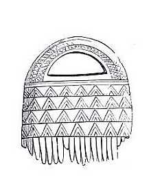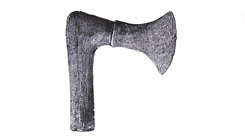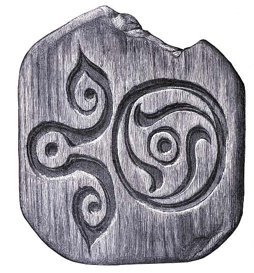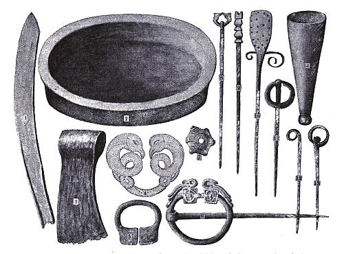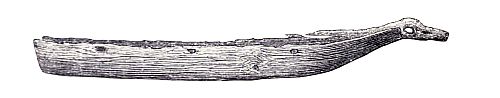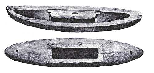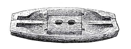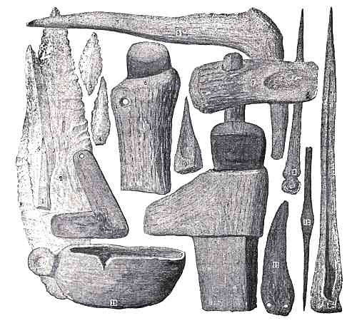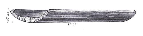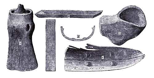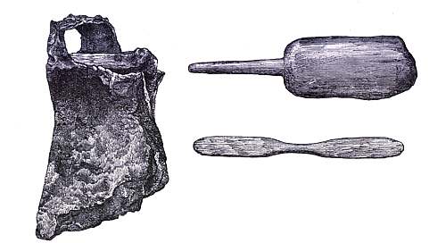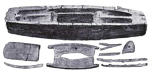 [84] An artificial island, 30 yards in diameter, thickly planted with timber and surrounded with piles. In 1870 a canoe was found on the shore of this islet, embedded in the mud and half destroyed by fire. In the stuff lying on its floor were found some iron tools—an adze, a hammer (both with handles), a socketed chisel, two whetstones, and some fragments of iron.
