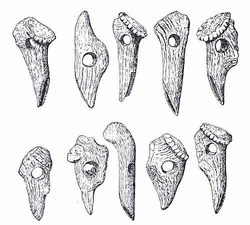 [68] A comb precisely similar to the one here figured (No. 30) is described and figured by Ossowski as coming from the cavern of Wierzchowska-Górna in Poland. Antiqua, 1887, p. 41, and pl. vii. Fig. 10.