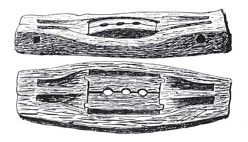 [119] This loch covers about two acres. At the north end there is a small island, covered with a rank vegetation and a few stunted trees of Scottish fir and birch. A rough, crooked causeway extended from it to the shore. "Round the island could be seen driven piles, to which were attached strong transverse beams, and upon making a cut six or seven feet wide into the side of the island to ascertain its structure, we found a platform of about four feet in depth, raised by transverse beams placed alternately across each other, and kept in position by driven piles. These last were generally small oak trees, but dressed and sharpened by a metal tool, some of them mortised at the heads, where a transverse rail or beam could be fixed."