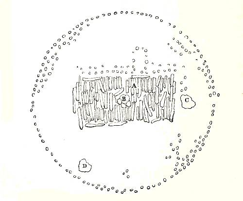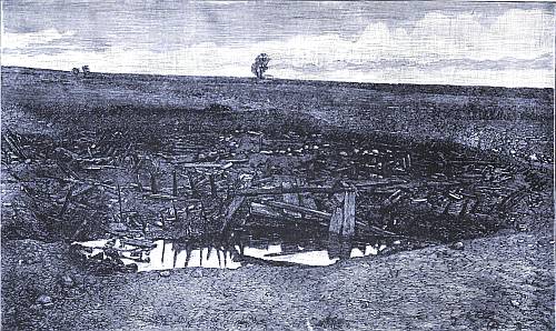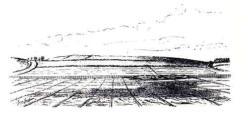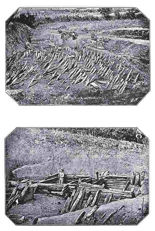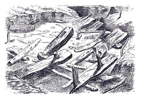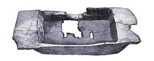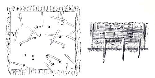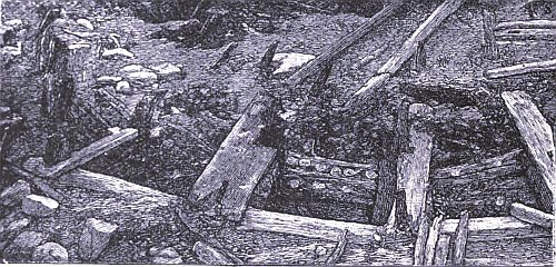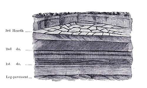[81] A curious wooden flooring, buried 14 feet in the bog. It rested on "a thick deposit of hazel and birch branches." Over it was a "collection of stone slabs, closely fitted together with a substratum of blue clay, but all laid on planks of timber forming part of the floor. On this there were quantities of ashes, proving that this was the fire-place of the ancient dwelling."
